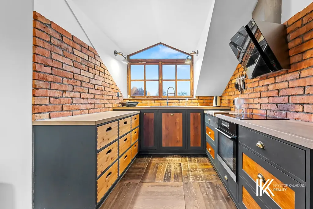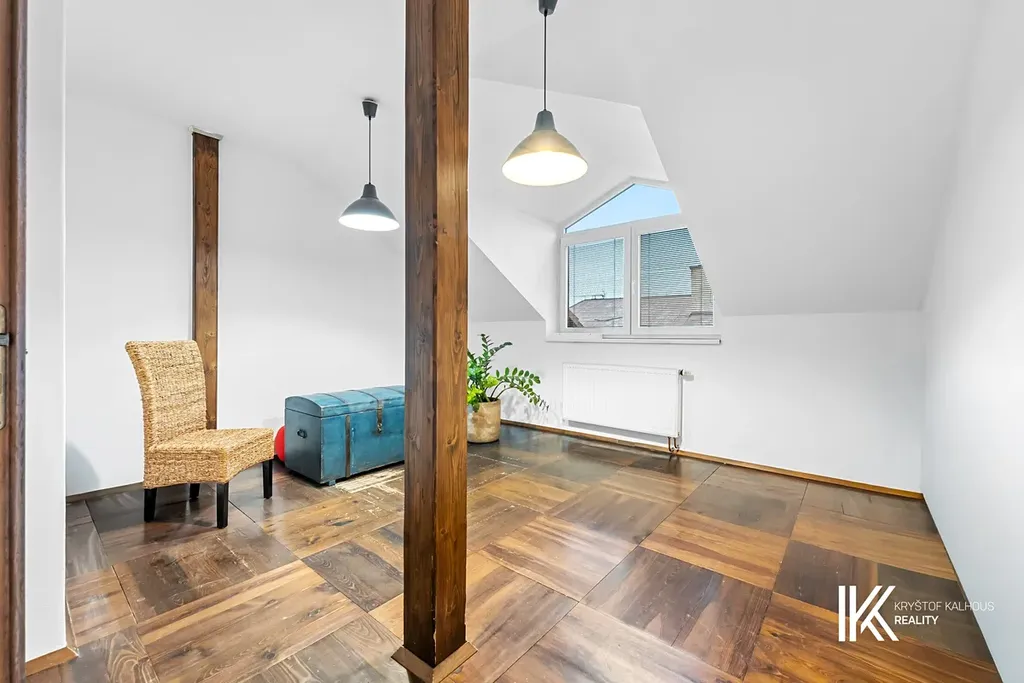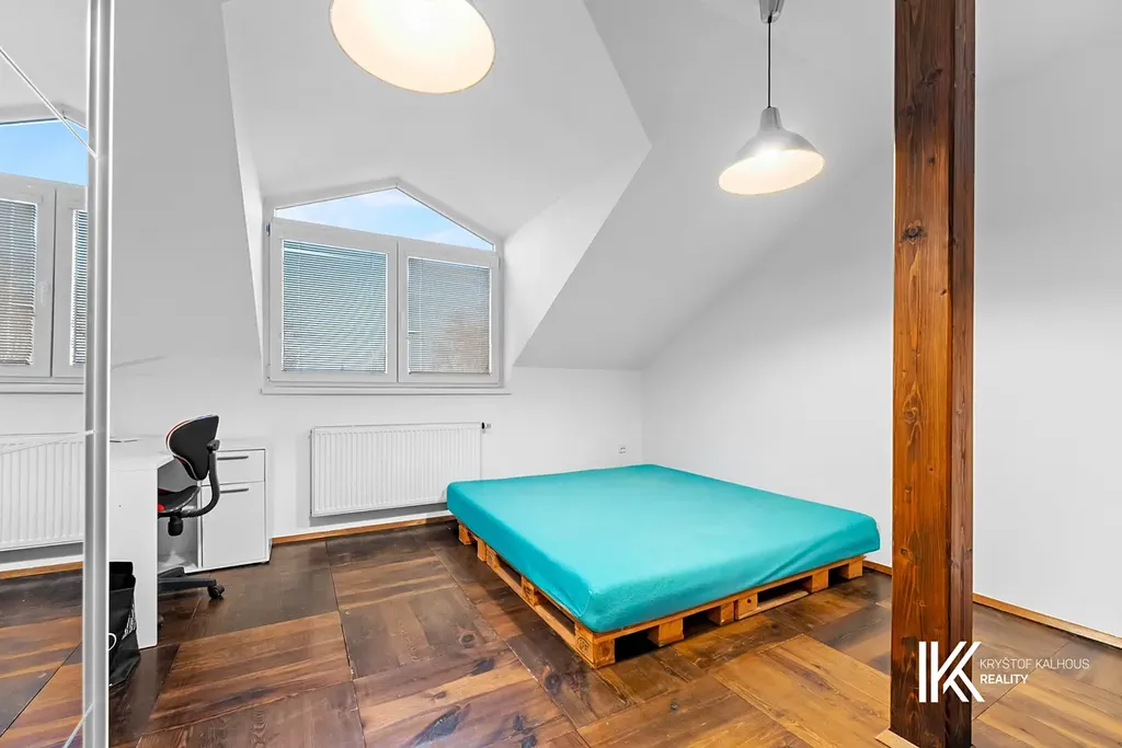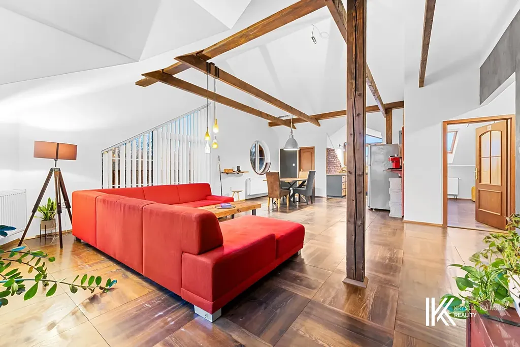 Ve druhém podlaží se nachází obytný apartmán o dispozici 4+kk a užitné ploše cca 156 m². Dominantou je světlý obývací prostor s kuchyňským koutem, spíží, vysokým stropem kopírujícím tvar střechy a velkými francouzskými okny. Apartmán dále nabízí tři ložnice, z toho jednu se dvěma šatnami, velkou koupelnu s vanou i sprchovým koutem, prádelnu s technickým zázemím a druhou samostatnou toaletu. Obytná část je orientována s ohledem na minimalizaci hluku z hlavní komunikace.