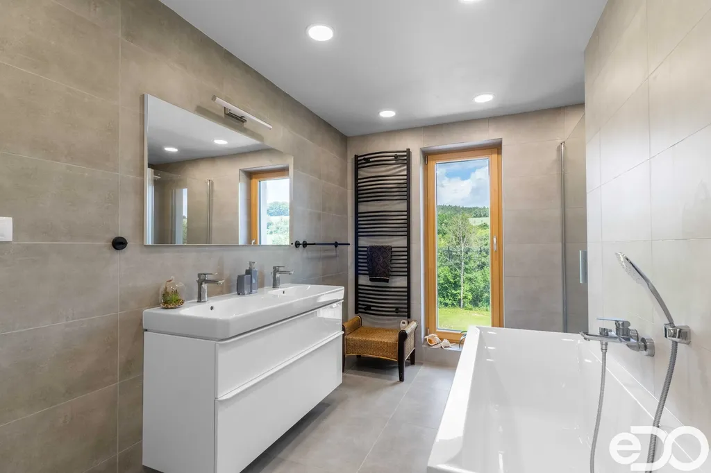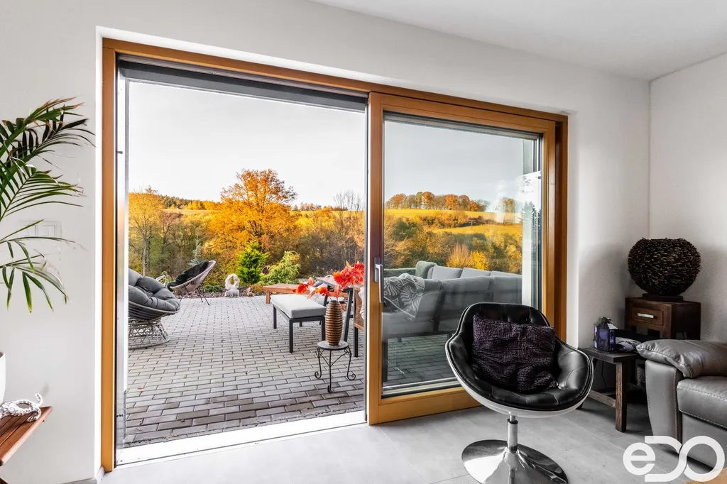 Pokud jste někdy hledali opravdu klidné místo k bydlení, tady ho najdete. Podívejte se na video prohlídku. Široko daleko nenajdete větší ticho a přitom jste max. 30 minut od Prahy. Ve Zvánovicích na Vás čeká novostavba rodinného domu 5+kk o užitné ploše 162 m², obklopená nekonečnou přírodou Voděradských bučin. Klid, prostor a čistý vzduch – ideální pro každého, kdo hledá skutečné útočiště mimo městský ruch. Z obývacího pokoje se otevírá krásný výhled do okolní přírody. Velké HS portály z kombinace dřeva a hliníku zajišťují nejen dostatek světla, ale i výbornou tepelnou a zvukovou izolaci. Všechna okna i dveře jsou z prvotřídních materiálů a vybavena trojskly.