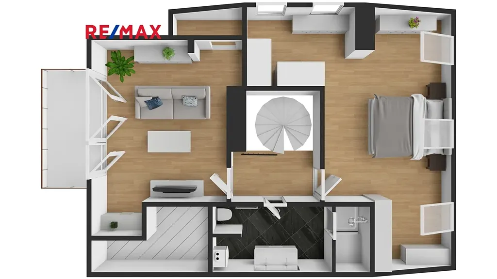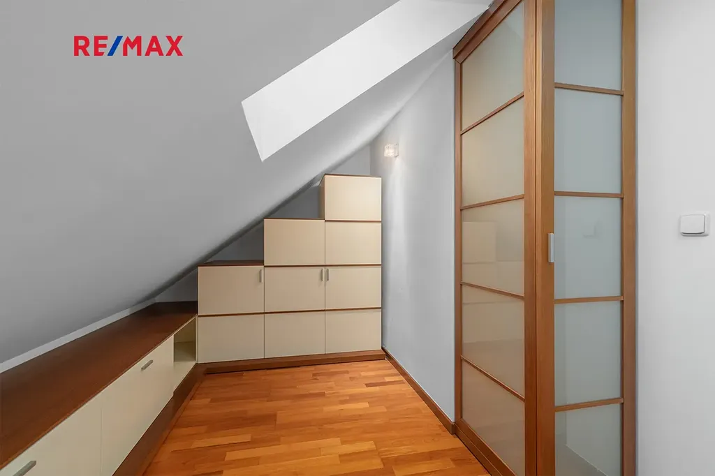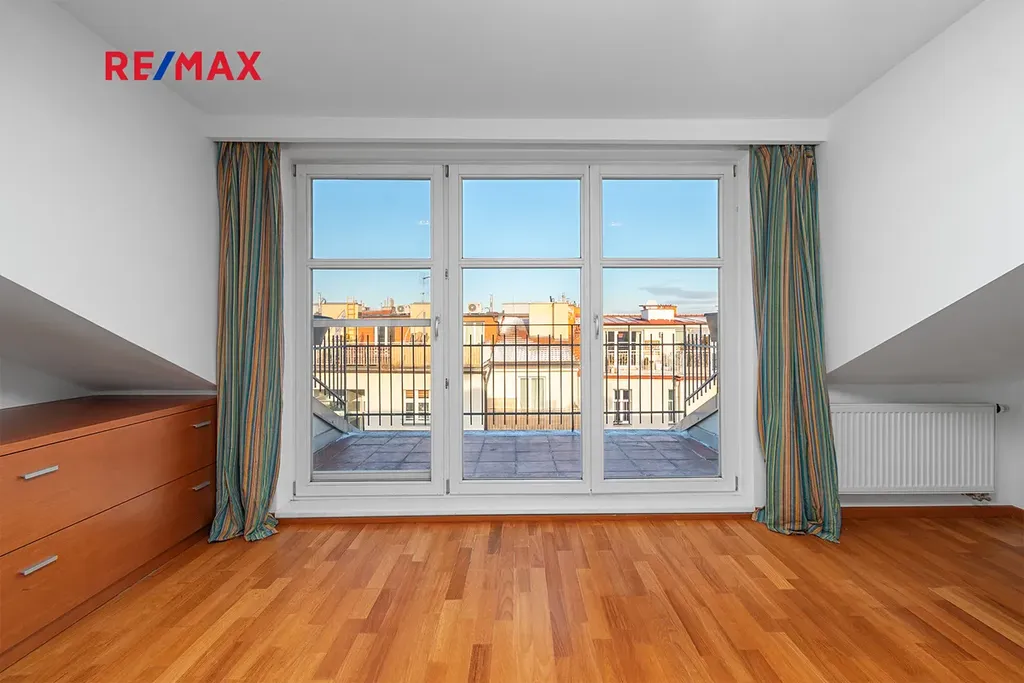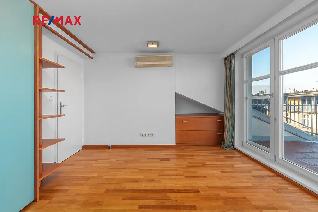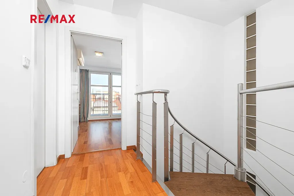 Po schodišti se dostanete do horního patra, které je pojato jako klidová zóna poskytující maximální soukromí a klid. Nachází se zde ložnice se šatnou a další samostatný pokoj, ze kterého je francouzským oknem přímý vstup na terasu, s výhledem do klidného vnitrobloku. Ideálně je tak rozšířen užitný prostor bytu, který se stává místem, kde může den začínat ranní kávou a končit klidným večerním posezením. Maximální pohodlí pak zajišťuje druhá koupelna se sprchovým koutem a toaletou.