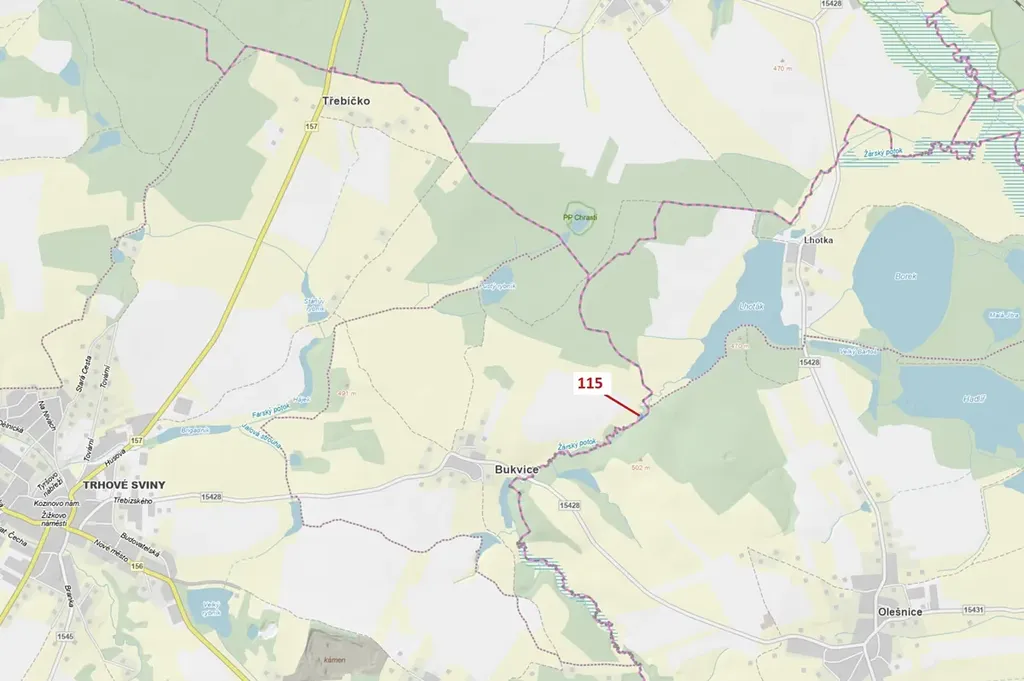 Lesní pozemek o výměře 590 m2, parcelní číslo 115, podíl 1/1, katastrální území Bukvice u Trhových Svinů, obec Trhové Sviny, obec s rozšířenou působností Trhové Sviny, okres České Budějovice, Jihočeský kraj.