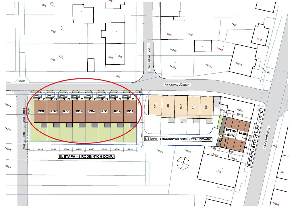 S projektem výstavby všech 8 domů se můžete seznámit v přiložené výkresové dokumentaci, kde je celková situace zástavby, celkové pohledy, dále půdorysy, řezy a pohledy jednotlivých domů.