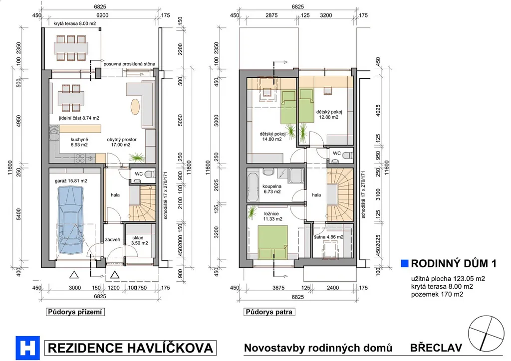 Užitná plocha je 123 m², plocha terasy je 7,32 - 8,00 m², celková výměra pozemku je od 160 do 211 m².