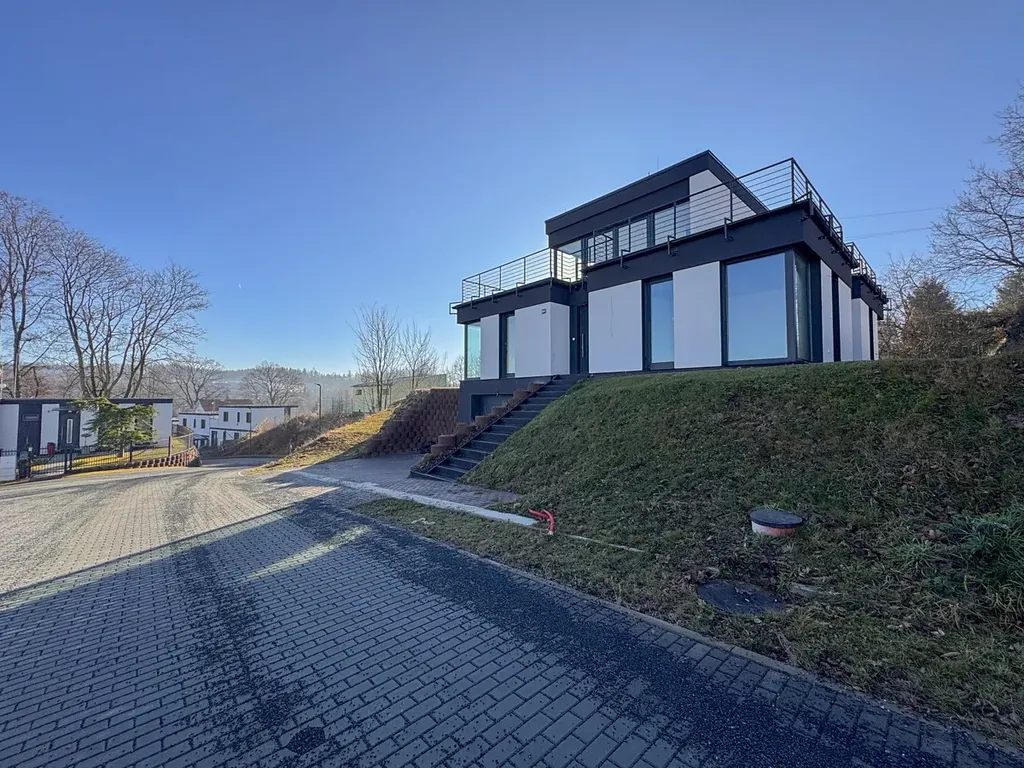 Nabízím k dlouhodobému pronájmu mimořádnou novostavbu rodinného domu v jedné z nejžádanějších částí Humpolce – Terasy. Jedná se o nemovitost pro nájemce, který hledá vyšší standard bydlení, soukromí, moderní architekturu a především výhledy, které se neokoukají. Dům je navržen tak, aby maximálně pracoval se světlem a prostorem – velkoformátová okna přivádějí den dovnitř a terasy přirozeně rozšiřují obytnou část směrem ven.