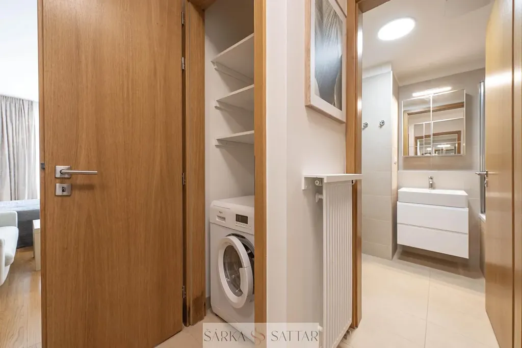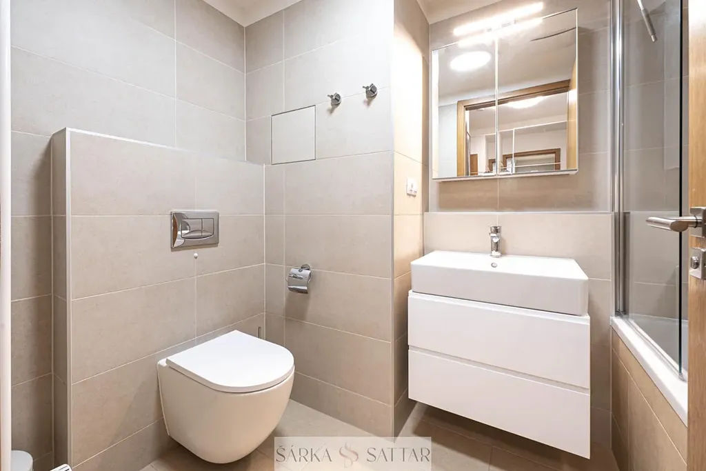 Koupelna je přístupná z chodby a má jak vanu, sprchu, umyvadlo, zrcadlo, úložný prostor. Komora poskytuje úložné prostory a také pračku. Na předsíni je praktická a velká skříň.