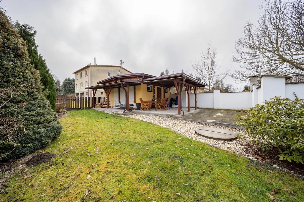 V domě je k dispozici kolárna a k bytu náleží sklepní kóje, garáž a prostorná zahrada se zděným zahradním domkem s krytou pergolou. Byt je částečně zařízený.