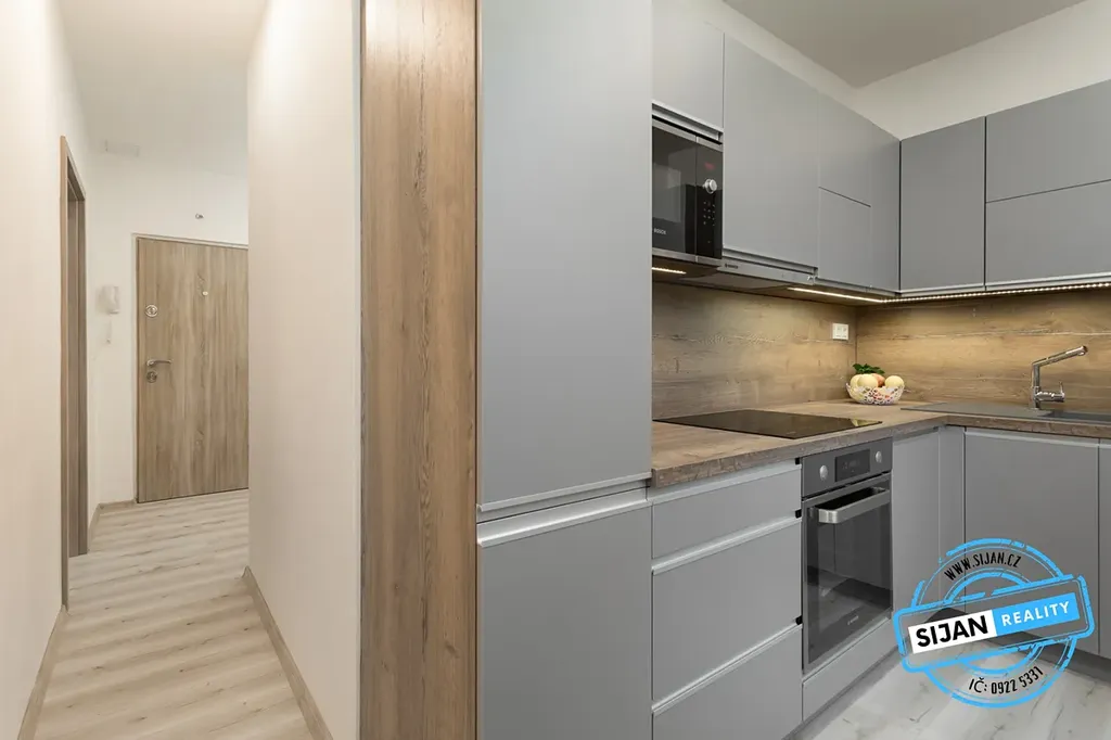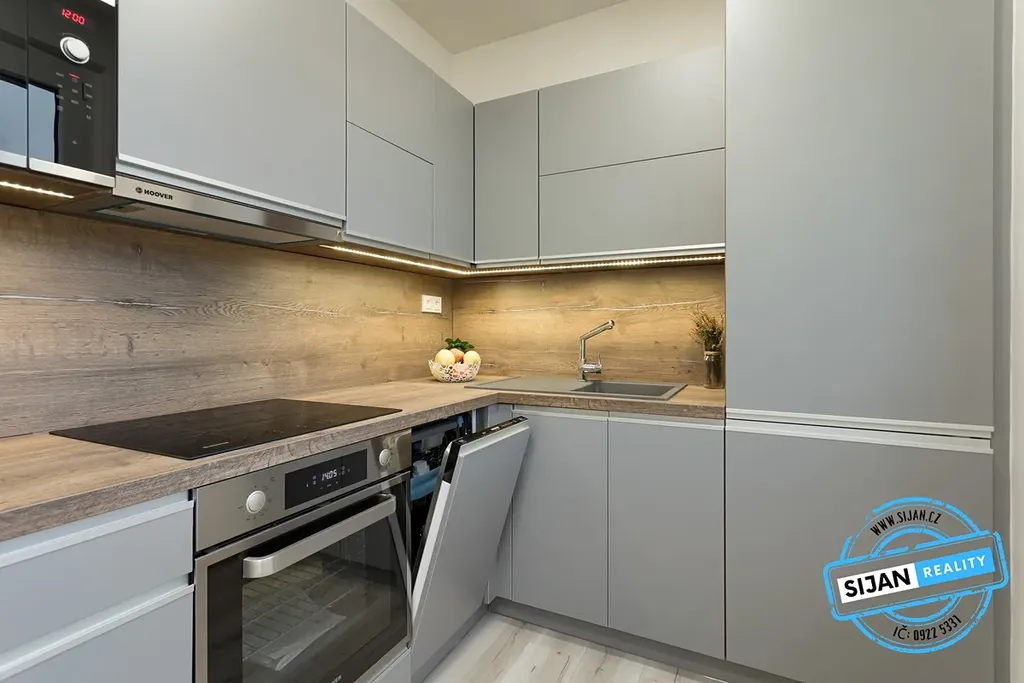 Součástí bytu je moderní kuchyňská linka na míru se zabudovanými spotřebiči:
