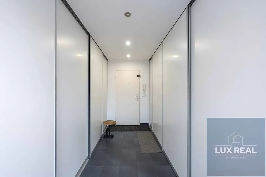 Vstupní chodba s vestavěnými skříněmi, které zároveň slouží i jako dveře oddělující chodbu od koupelny (sprchový kout, samostatně stojící vana, a oddělená toaleta), ale i od obytného otevřeného prostoru. Z této vstupní chodby se dostane také přímo na terasu.