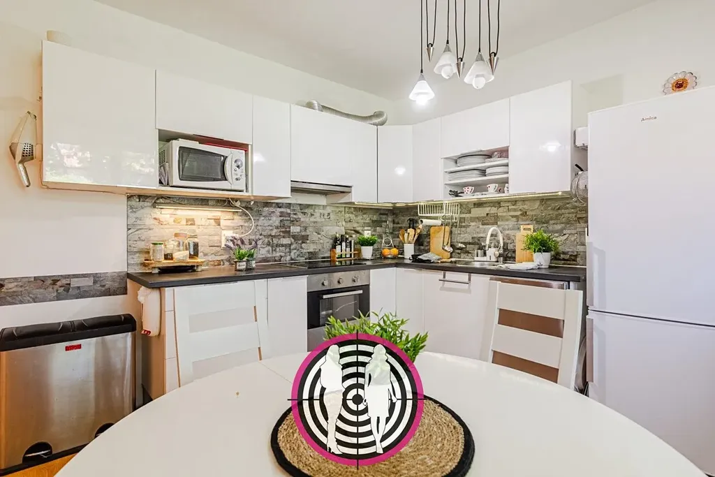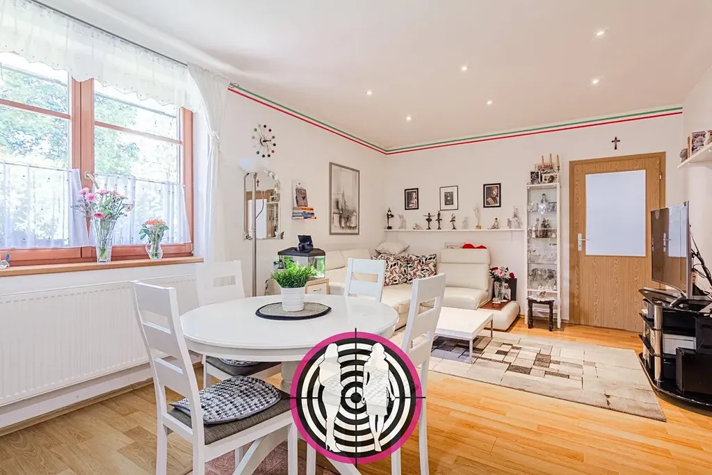 Byt je dispozičně řešen jako 3+kk o výměře 66,2 m2, je v osobním vlastnictví a nachází se ve zvýšeném přízemí klidného zděného domu. Hlavní dominantou bytu je obývací pokoj s kuchyňskou linkou, přístupem do ložnice, dále pak prostorná chodba, ze které se dostanete do dětského pokoje, koupelny a samostatné toalety.