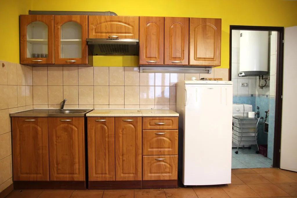 Z prostorného zádveří se vpravo vstupuje do obytné části v 1. NP, konkrétně do kuchyně o výměře 14 m2, která je vybavena malou kuchyňskou linkou. Z kuchyně vlevo lze vstoupit do společné koupelny s vanou a WC. V této místnosti je také technický koutek s bojlerem zajištujícím rozvody teplé vody i do kuchyně a expanzní nádoba pro regulaci centrálního vytápění. Tato místnost má podlahovou plochu o výměře 6 m2. Z kuchyně se také vchází do obytné místnosti o výměře 22,4 m2. V této místnosti jsou krbová kamna, kterými je přes výměník a rozvody do deskových radiátorů zajišťováno vytápění všech obytných místností.
