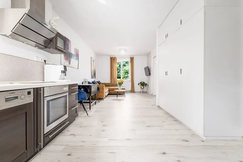 Kuchyně v nadčasovém provedení je součástí obývacího pokoje. Prosvětlené místo s oknem potěší dostatkem světla i prostoru. Svou velikostí ( 27 m2 ) a tvarem poskytuje místnost skvělé zázemí pro vaření, stolování i relaxaci. Výhledy na řeku pak dotváří tu pravou atmosféru bydlení na Hluboké. Přímo z postele v ložnici ( 10 m2 ) si dokonce můžete vychutnat kouzelný výhled i na vrchol zámecké věže. Velmi útulný je i další pokoj ( 12 m2 ), který se nabízí k využití jako pro děti, pracovna nebo příležitostné přespání návštěvy. Prostorná koupelna ( 5,5 m2 ) s neutrálním béžovým odstínem obkladu se sprchovým koutem, bidetem a toaletou. Je zde prostor pro umístění pračky.