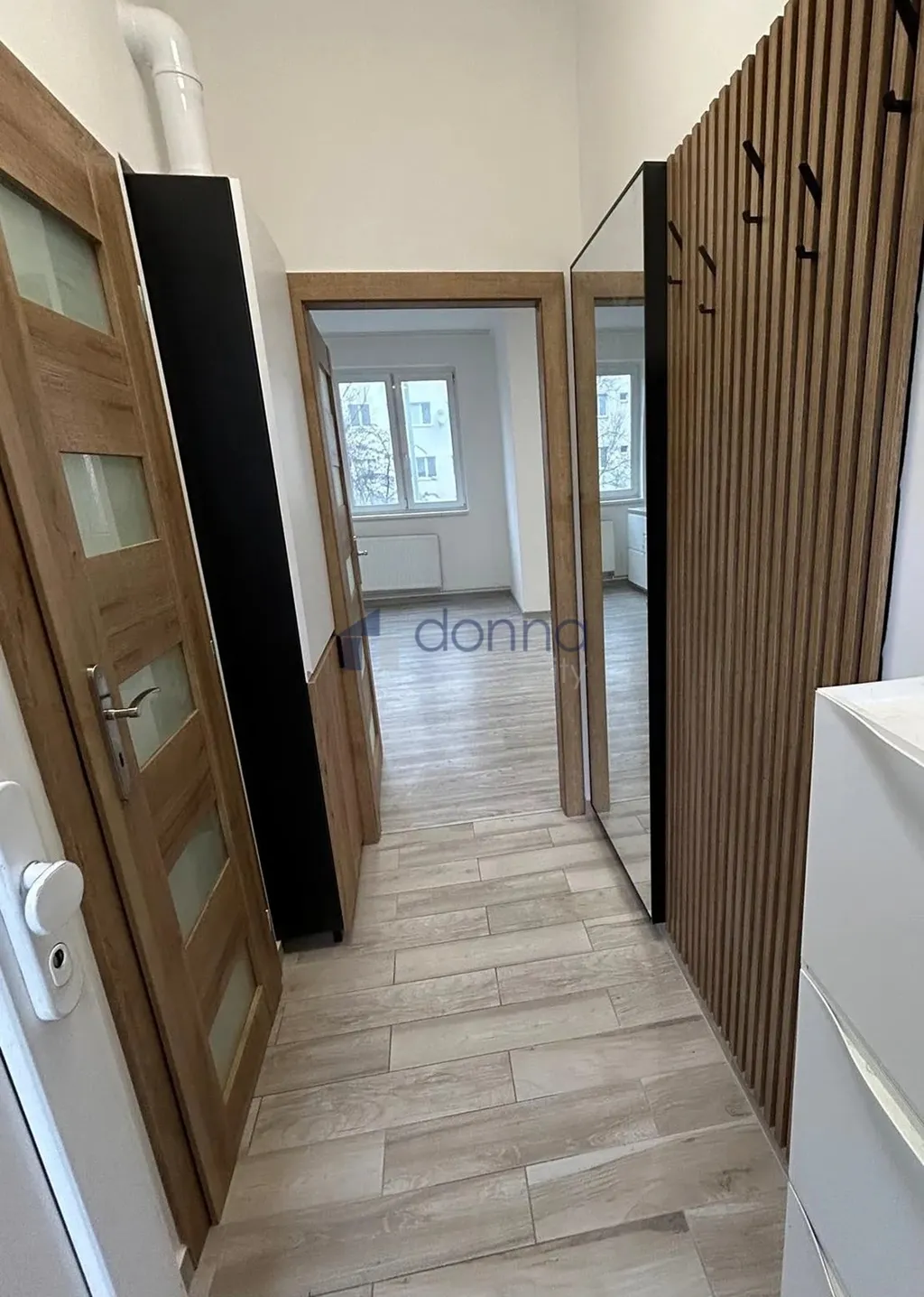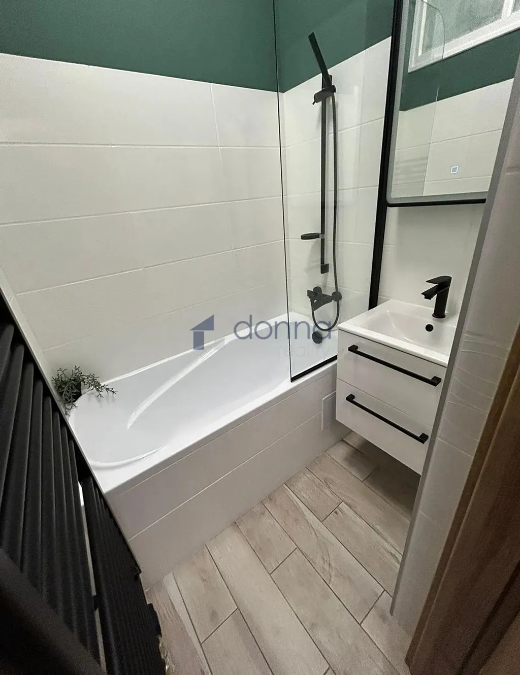 Chodba, samostatná koupelna s vanou, topným žebříkem a LED zrcadlem, oddělené WC, ložnice a velká obývací místnost s kuchyňskou linkou (pračka, myčka, trouba, indukční deska, digestoř).