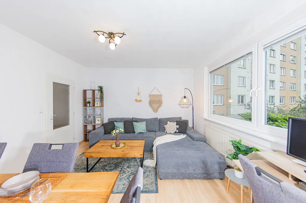 Kuchyně je vybavená kuchyňskou linkou s plynovým sporákem a elektrickou troubou, digestoří, lednicí, pračkou a mikrovlnnou troubou, což zajišťuje plný komfort při vaření. V prostorném obývacím pokoji nechybí velká rohová sedačka a moderní konferenční stolek, který je dokonale sladěný se stylovým jídelním stolem. Nad kterým se nachází televize. Pod okny najdete také praktický psací stůl na PC.