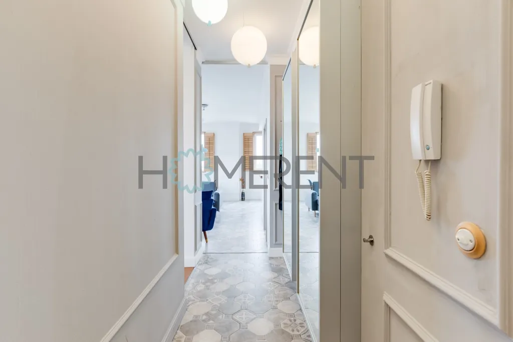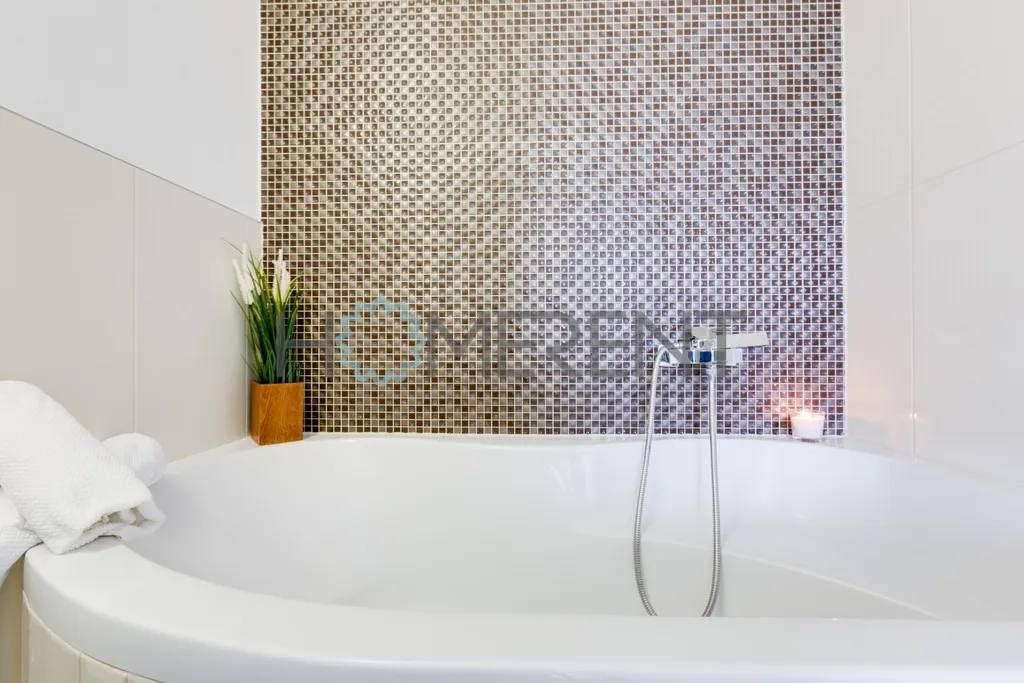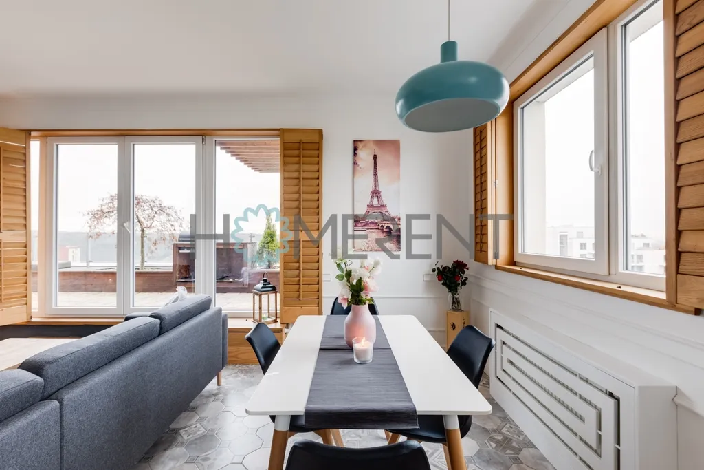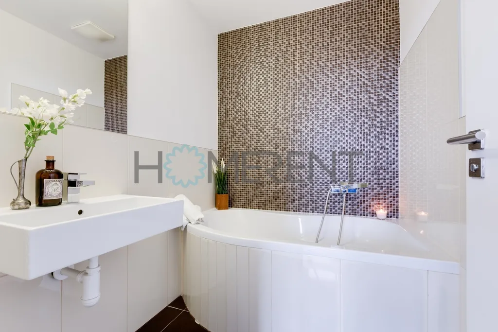 Interiér bytu je promyšlený a působí velmi vzdušně a elegantně. Dispozice zahrnuje prostorný obývací pokoj propojený s kuchyní a jídelnou, hlavní ložnici a druhý pokoj, který je aktuálně nezařízený – lze jej dovybavit dle potřeb nájemce, například jako pracovnu, dětský pokoj, druhou ložnici či šatnu. Součástí bytu je koupelna s vanou, samostatná toaleta, pračka a dostatek úložných prostor.