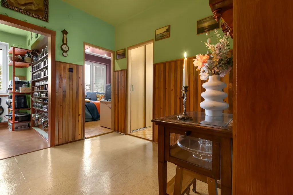 Obývací pokoj je přístupný přes nádherné dvoukřídlé posuvné dveře z masivního dřeva s prosklenými výplněmi, které dodávají interiéru originální charakter. K relaxaci vybízí rozlehlá zasklená lodžie s výhledem do okolí.