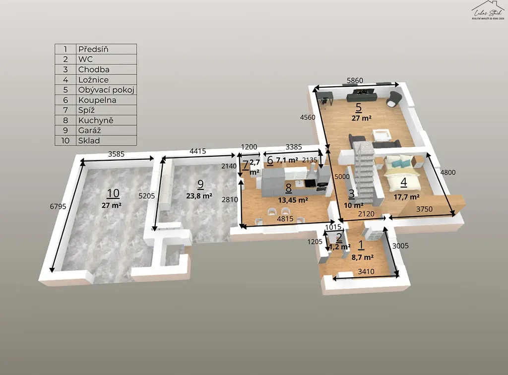 Přízemí (1. NP) prošlo kompletní a pečlivou rekonstrukcí, zatímco 2. NP zůstalo v původním stavu – připravené pro nové nápady, které můžete realizovat na ploše 98 m² půdy, jak vidíte i na 3D plánku.