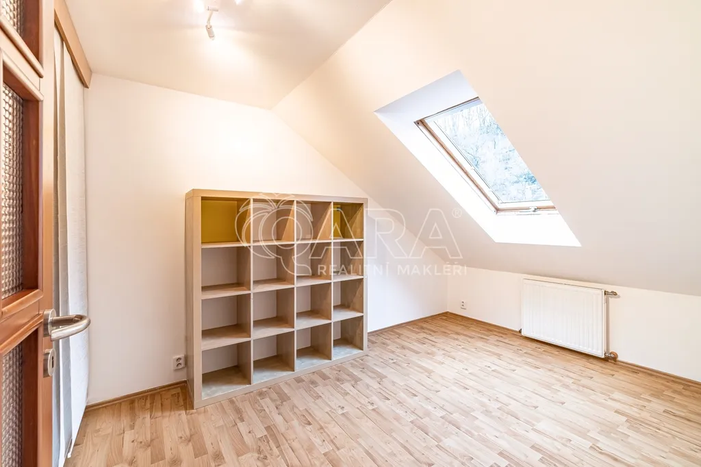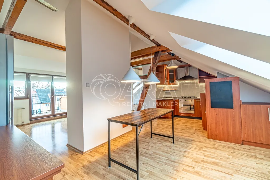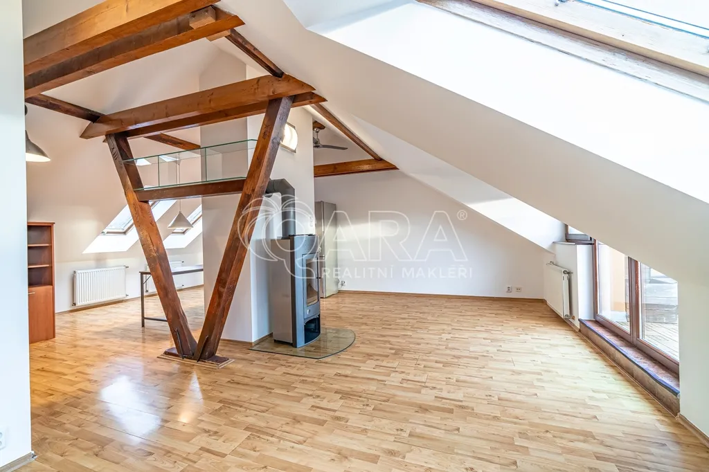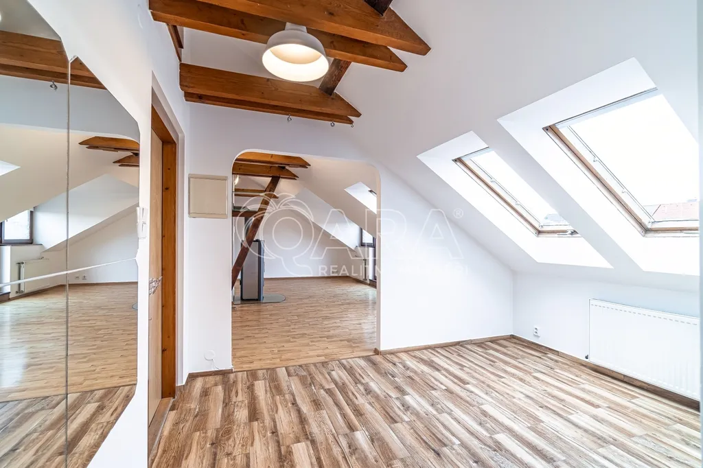 Tento byt je v posledním patře (3. patro bez výtahu) a kombinuje útulnost podkroví s nadstandardním prostorem pro celou rodinu.