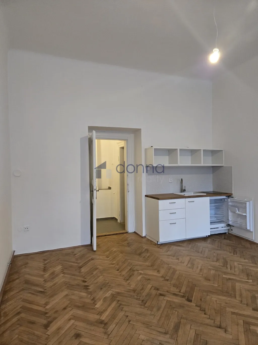 Zařízený pouze kuchyňskou linkou s lednicí, jinak bez nábytku.