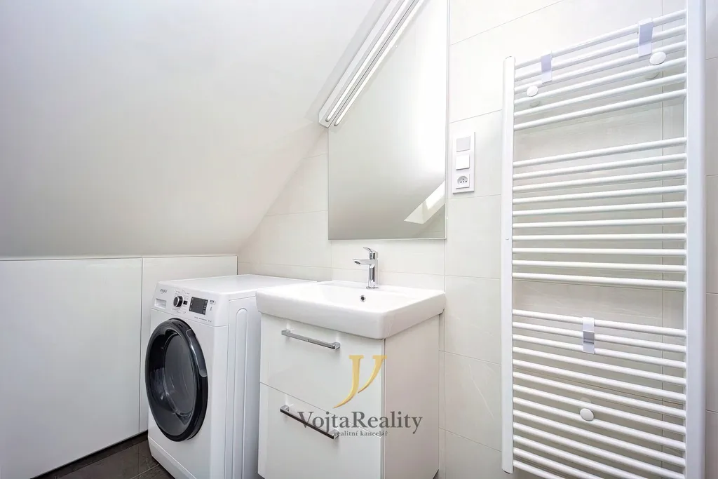 Moderní kuchyňská linka je osazena vestavěnými spotřebiči značky Whirlpool – lednicí s mrazákem, indukční varnou deskou, integrovanou myčkou nádobí a mikrovlnnou troubou. V bytě je dále klimatizace, vnitřní i venkovní žaluzie a moderní osvětlení ovládané dálkovým ovladačem. Podlahy jsou plovoucí, okna plastová s izolačními trojskly. Koupelna je vybavena komfortním sprchovým koutem, toaletou a pračkou se sušičkou.