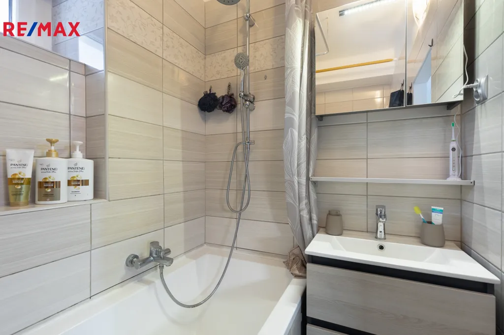 ✅ Koupelna s oknem, s obkladem v béžové barvě, je vybavena podélnou vanou, umývadlovou skříňkou, plynovým kondenzačním kotlem