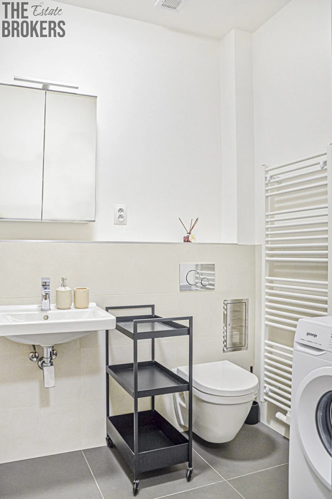 Byt je částečně vybavený a připravený k nastěhování. Součástí je moderní kuchyňská linka s vestavěnými spotřebiči: lednice, mrazák, varná deska, trouba a myčka. V koupelně se nachází pračka. K dispozici je také rozkládací pohovka, dvě prostorné šatní skříně a postel s kvalitními matracemi.