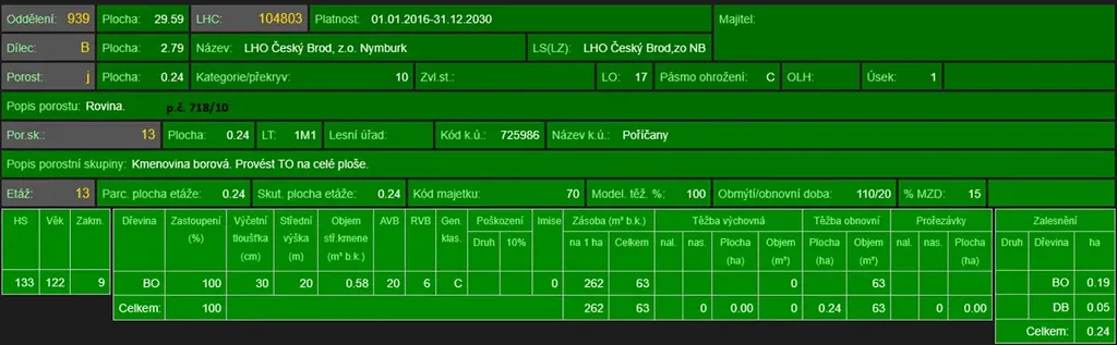 - p.č. 718/1 vedená jako lesní pozemek o celkové výměře 27 036 m2, z toho vlastníme podíl 1/4 tedy 6 759 m2 (stáří lesa 141 let - zastoupení dřevin borovice),