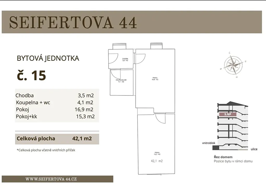 K prodeji nabízíme chytře řešený byt 2+kk o výměře 42,1 m², v 5.NP, který se nachází v činžovním domě na adrese Seifertova 44.