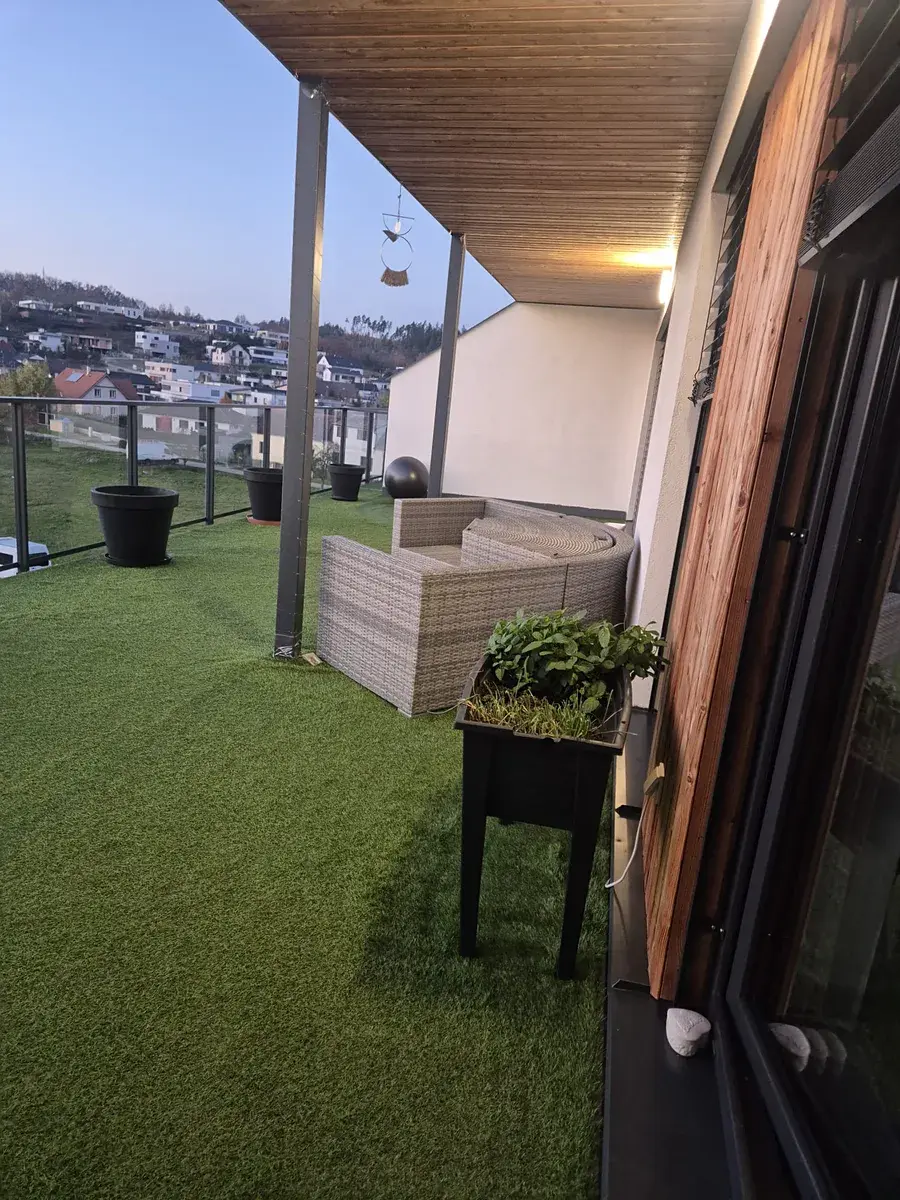 Součástí je prostorná terasa o velikosti 39,28 m², jedno parkovací stání a sklep.