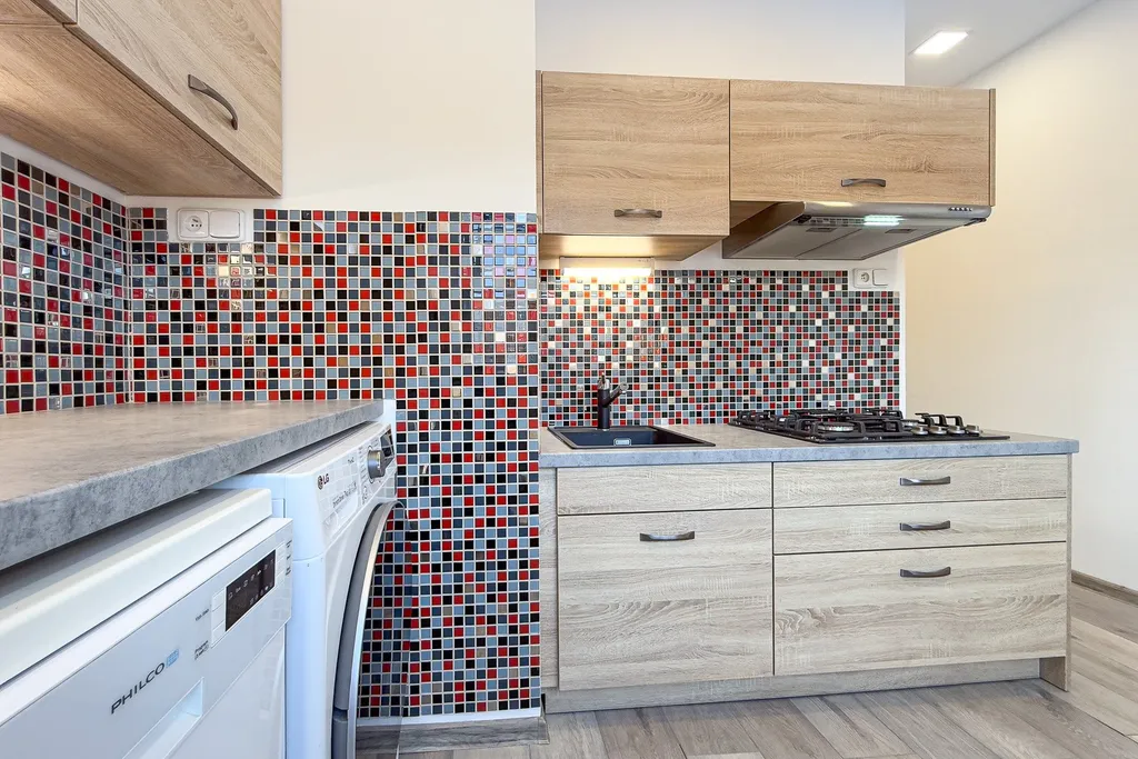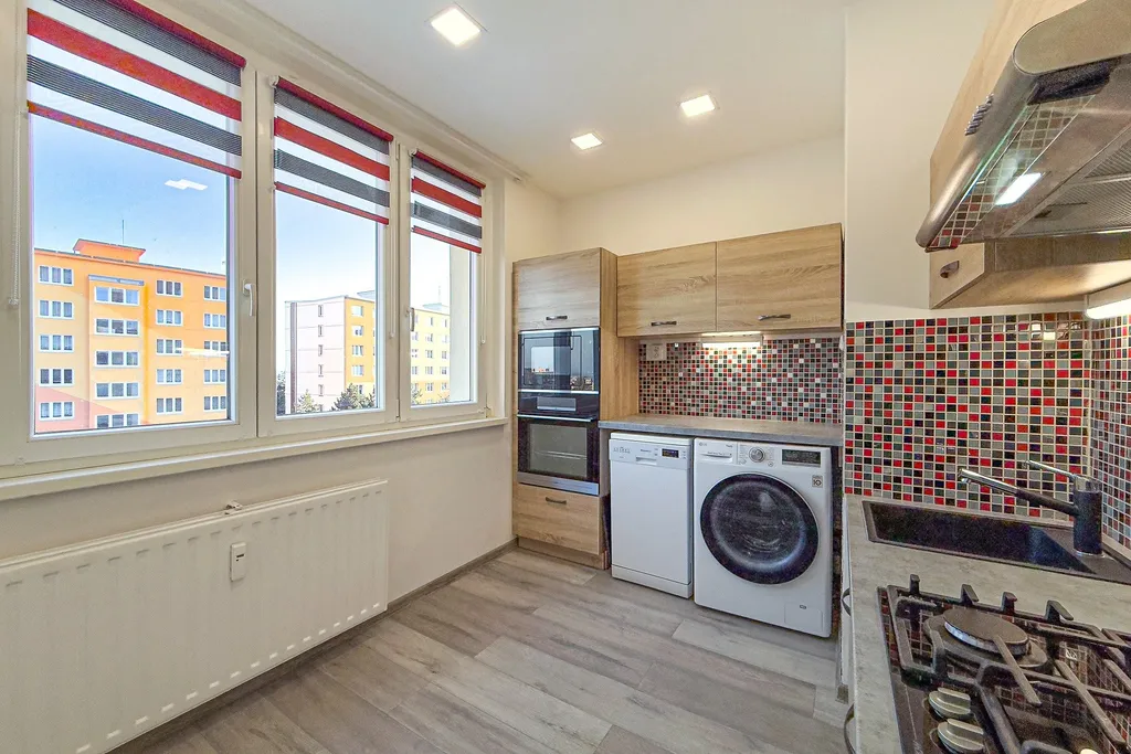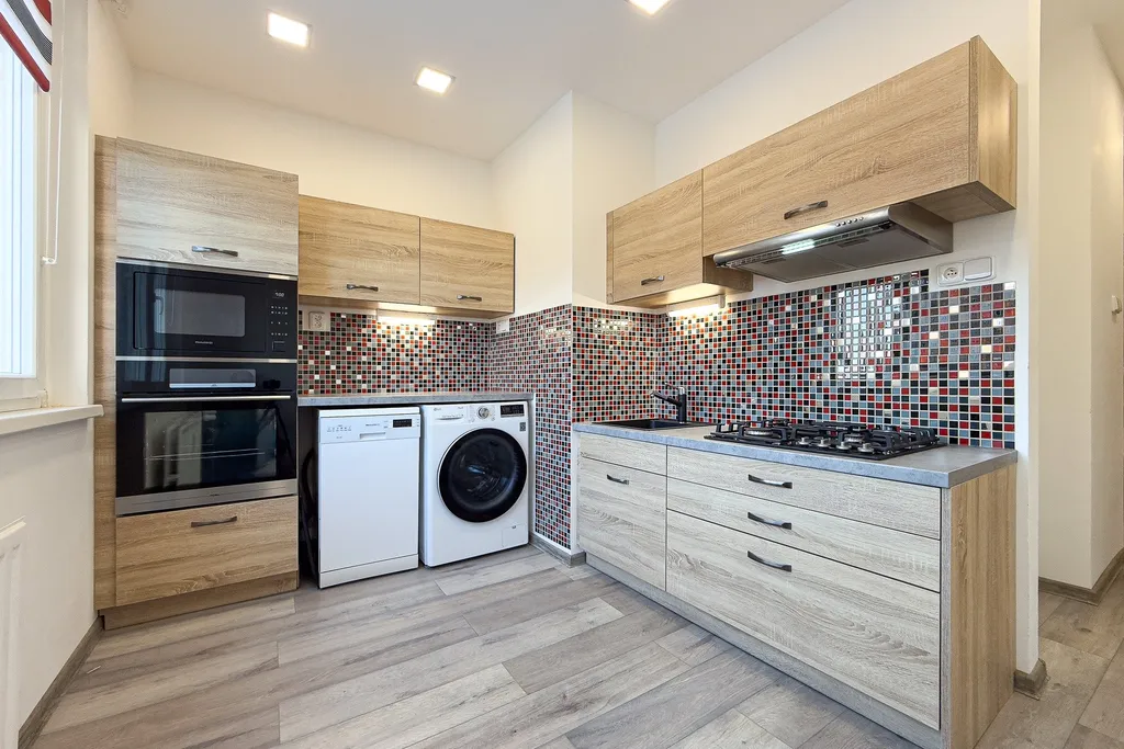 V bytě zůstává: kuchyňská linka na zakázku, plynový vestavěný sporák, digestoř, vestavěná elektrická trouba, multifunkční mikrovlnná trouba, pračka a myčka nádobí, dvě skříně, komoda, věšák.