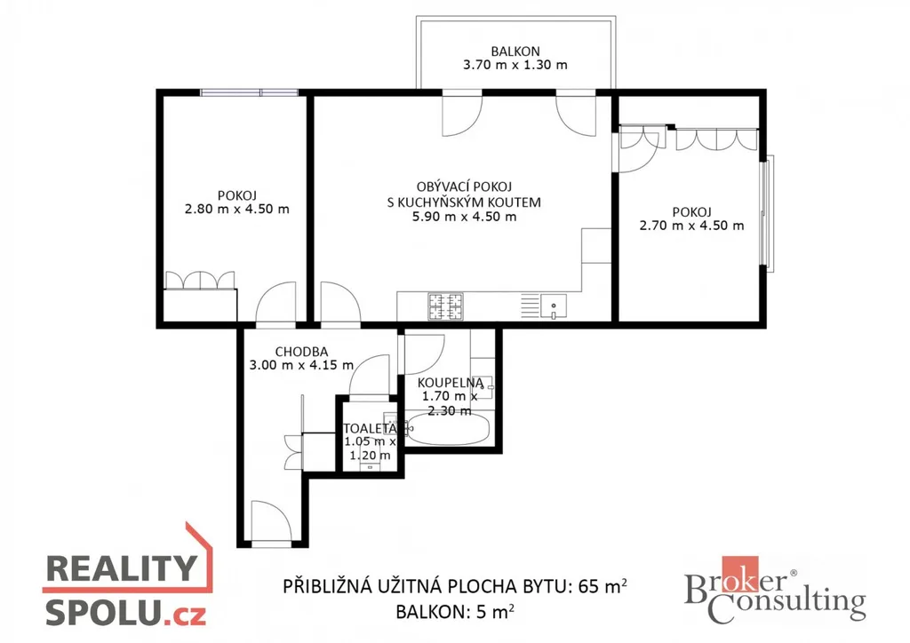 Celková plocha bytu je 73,7 m² včetně balkonu a sklepu. Užitná plocha bytu je cca 63 m².