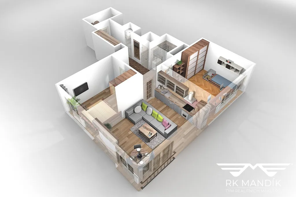 Kuchyňská linka je k dispozici včetně vestavných spotřebičů: lednice s mrazákem, indukční varná deska, digestoř, myčka nádobí a elektrická trouba. Obývací část je zařízena sedací soupravou, konferenčním stolkem, jídelním stolem se židlemi a TV stěnou.