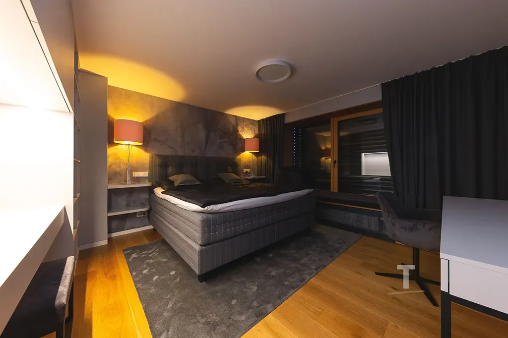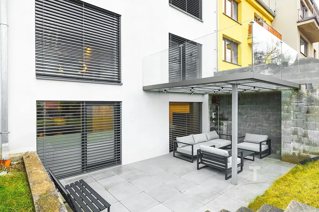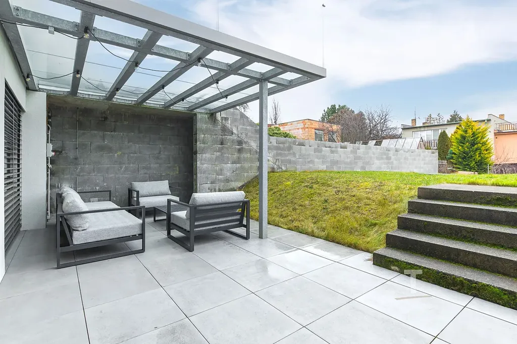 Nabízíme k pronájmu luxusní rodinný dům, který je řešen jako 5+1 se dvěma prostornými terasami a vinným sklepem. Je orientován východním a západním směrem. Celková výměra pozemku činí 347m2, užitná plocha domu je 260m2 včetně teras a balkonu. Jedná se o nemovitost, která působí zvenku diskrétním vzhledem, avšak jeho provedením, dispozicí, prosvětleností, použitými materiály a značkami osazených komponentů se jedná o záležitost velmi luxusní. Díky proskleným plochám jsou z něj nádherné výhledy do okolí. Interiér byl proveden dle návrhu studia Atmosféra Design Lenky Zimmermannové. Jedná se o klidnou část města, kdy umístění je mimo rušnou komunikaci. Ulicí projíždí pouze místní sousedi. Dům disponuje garáží pro motorku, kola či kočárek. Před domem se nachází parkovací stání pro 3 automobily. Třída energetické náročnosti je B. Dům prošel rozsáhlou rekonstrukcí v nadstandardním stylu, je vybaven kompletně zařízenou kuchyňskou linkou se spotřebiči, koupelnami na mírů, dále gauč v obývacím pokoji na míru, celá vstupní předsíň s vestavěným nábytkem a částečné vnitřní vybavení ložnice.