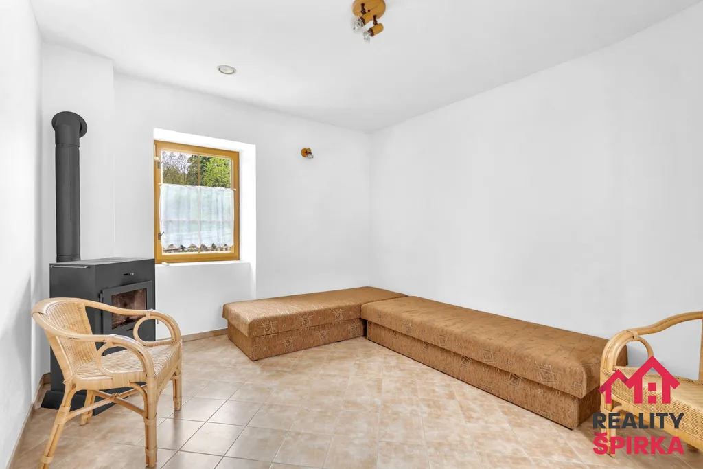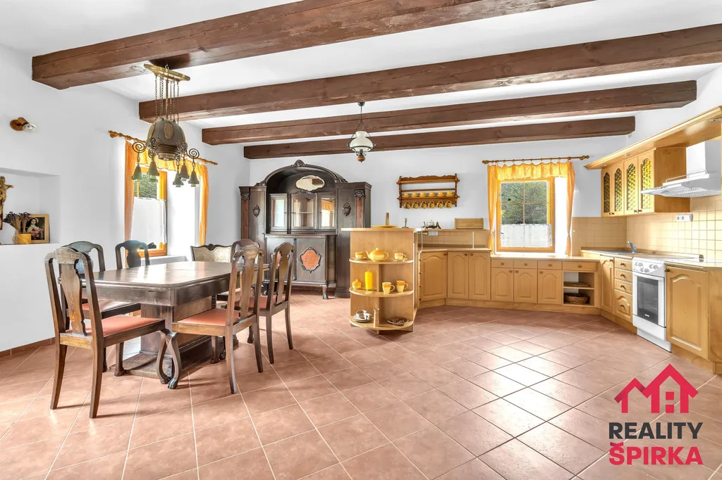 2+kk s velkorysou místností se stylovými krovy – kuchyň, jídelna a obývák v jednom, samostatný pokoj, krb s rozvody tepla, koupelna se sprchovým koutem, samostatné WC, chodba, spíž.