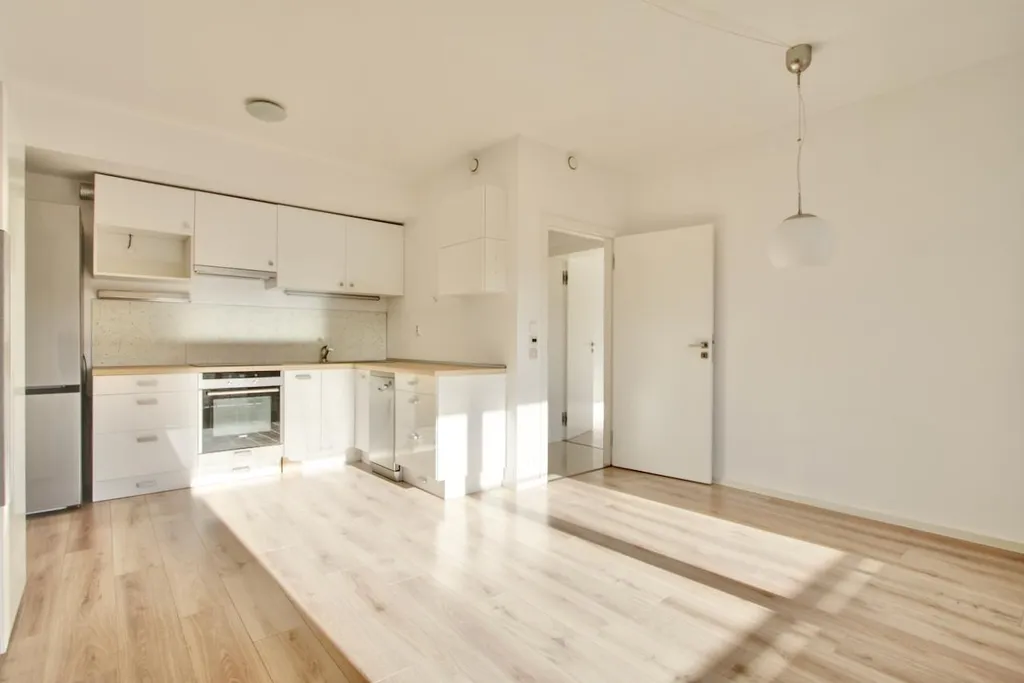 Obývací pokoj s kuchyňským koutem, balkon a jedna z ložnic jsou orientovány na jih, druhá ložnice je prakticky umístěna na sever.