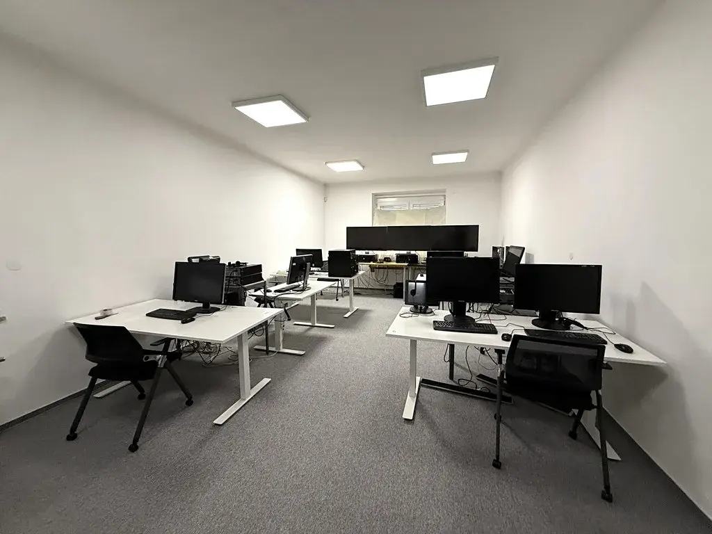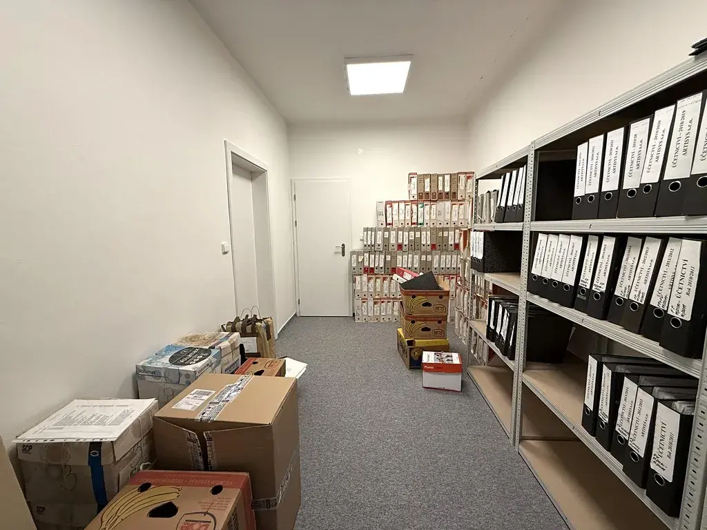 Jedná se o dvě samostatné kanceláře o velikosti cca 38 m2 a cca 12 m2, které se nachází v přízemí budovy. Větší místnost může sloužit jako hlavní kancelářský prostor a menší místnost jako zázemí pro další pracovní místo, archiv či sklad dokumentů. Obě místnosti jsou světlé. Hlavní kancelář je nově vybavena malou kuchyňskou linkou s dostatečným úložným prostorem a dřezem. Menší kancelář se nabízí bez vybavení. Na chodbě jsou společné prostory jako je WC nebo zasedací místnost, kterou si lze pronajmout za poplatek. Zasedací místnost je vybavena velkým stolem se židlemi, křesly, televizemi a dalším nábytkem včetně kuchyňské linky s dřezem a lednicí.