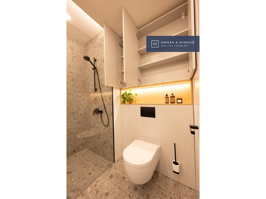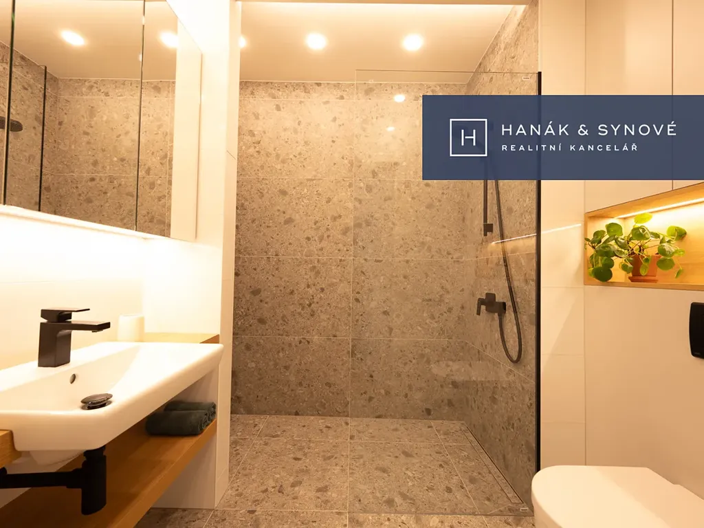 Byt je zařízený ve vysokém standardu a je nabízen kompletně zařízený – kuchyňská linka se spotřebiči (varná deska, trouba, mikrovlnná trouba, vestavěná lednice s mrazákem, pračka a sušička, myčka), vestavěná skříň, postel, jídelní stůl se židlemi, venkovní žaluzie. Koupelna je vybavena walk-in sprchovým koutem se skleněnou zástěnou značky HÜPPE, záchodem a umyvadlem s umyvadlovou skříňkou, podsvíceným zrcadlem.