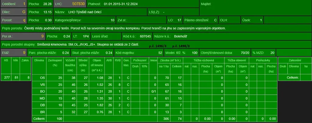 - p.č. 1498/3 vedená jako lesní pozemek o celkové výměře 534 m2 (stáří lesa 91 let - zastoupení dřevin topol, vrba, borovice, modřín, dub, bříza).