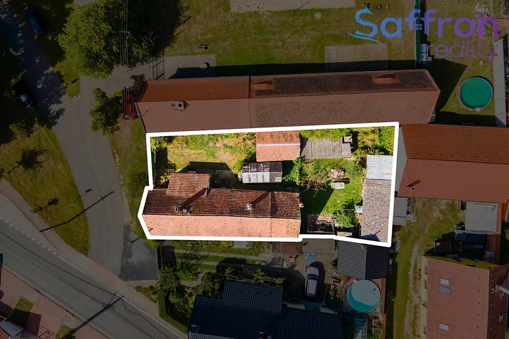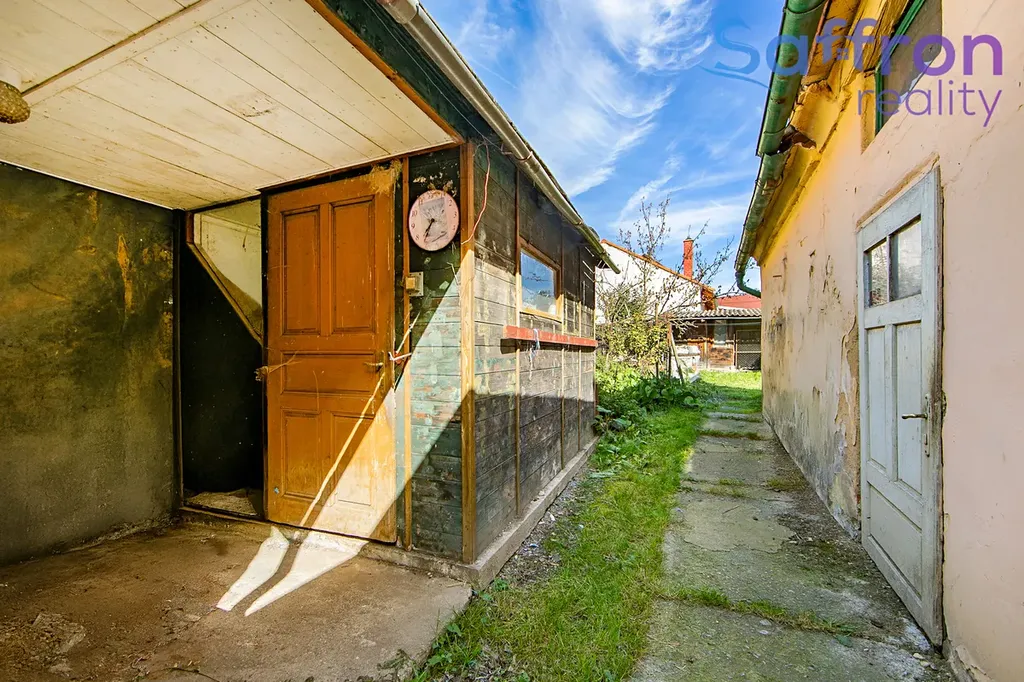 Za dvoukřídlou bránou se otevírá dvůr s parkováním na vlastním pozemku, na který navazuje menší chatka a několik hospodářských přístavků vhodných pro dílnu, sklad či dočasné bydlení během rekonstrukce. Samotný dům je před rekonstrukcí střechy, interiérů i rozvodů, což dává novému majiteli volnost navrhnout dispozice a standard přesně podle svých představ a plně využít potenciál zahrady i dvora k propojení interiéru s venkovním prostorem.