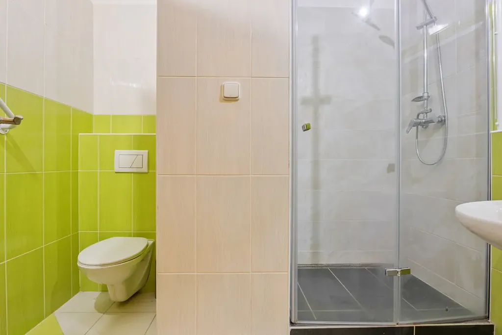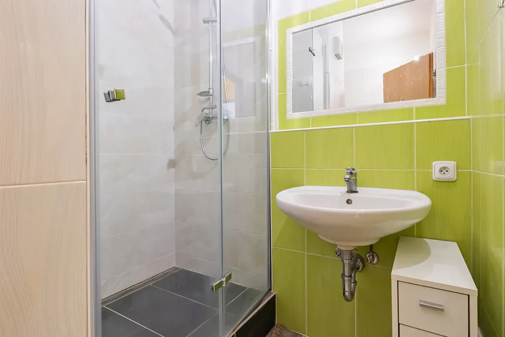 V koupelně se nachází sprchový kout, umyvadlo a WC.