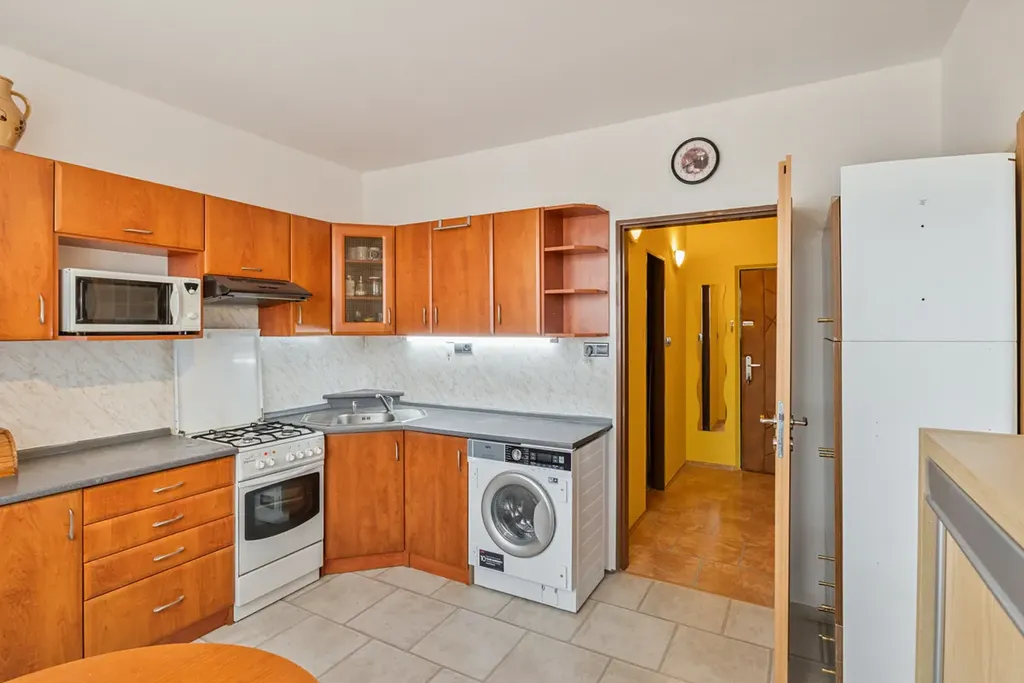 Ze vstupní chodby je přístupná kuchyně a koupelna. Kuchyně je zařízena kuchyňskou linkou vybavenou plynovým sporákem, troubou, digestoří, lednicí a pračkou.