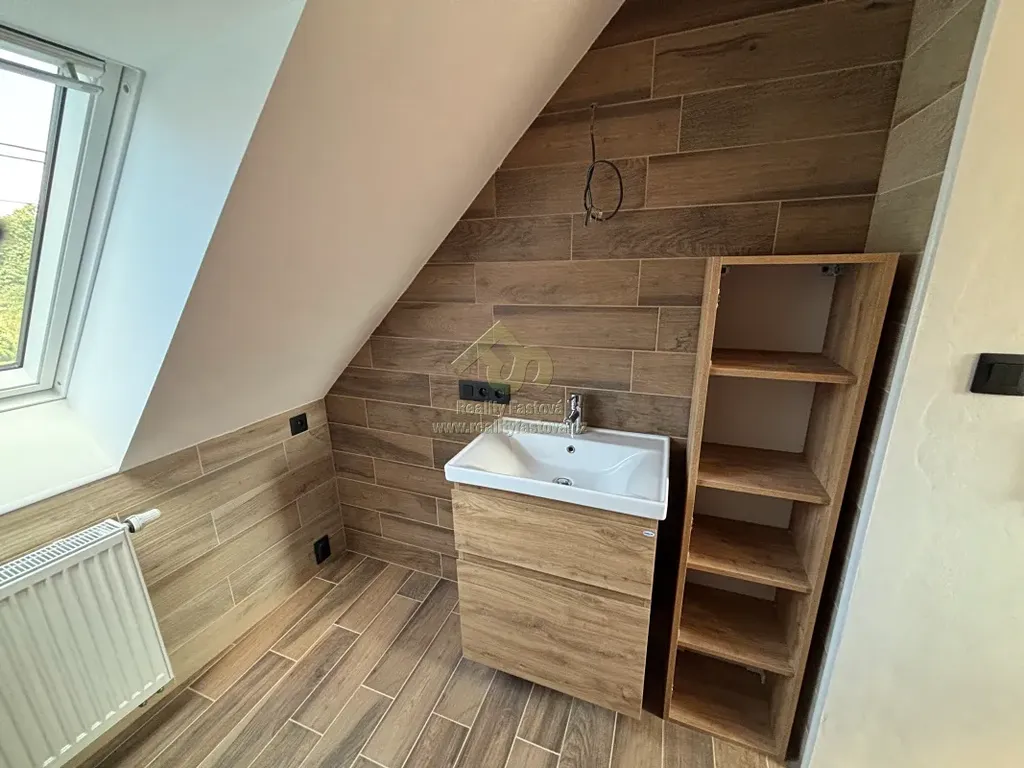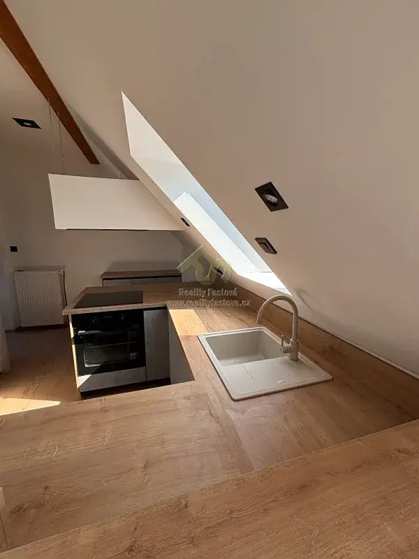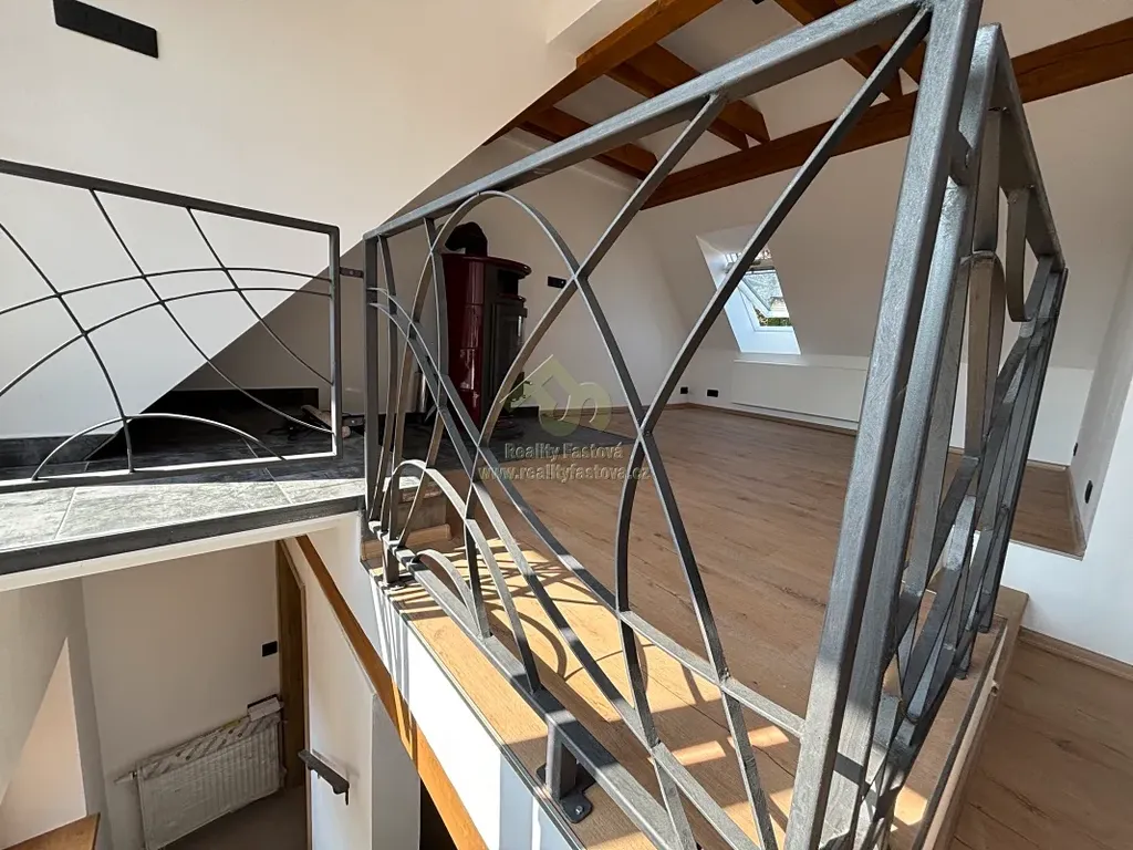 Do obytné části se vystupuje do patra po schodišti s designovým kovovým zábradlím. Otevře se před vámi krásný a prosvětlený podkrovní byt, o vel. 2+kk. Vlevo obývací pokoj s krbovými kamny, který při chladnějším počasí vykouzlí romantické večerní teplo. Uprostřed bytu je kuch.kout s vestav.spotřebiči el.sporák s troubou, digestoří a myčkou. V krásné a prostorné koupelně je vyzděný sprchový kout, umyvadlo a toaleta. Vedle kuchyně se dále nachází samostatný pokoj.