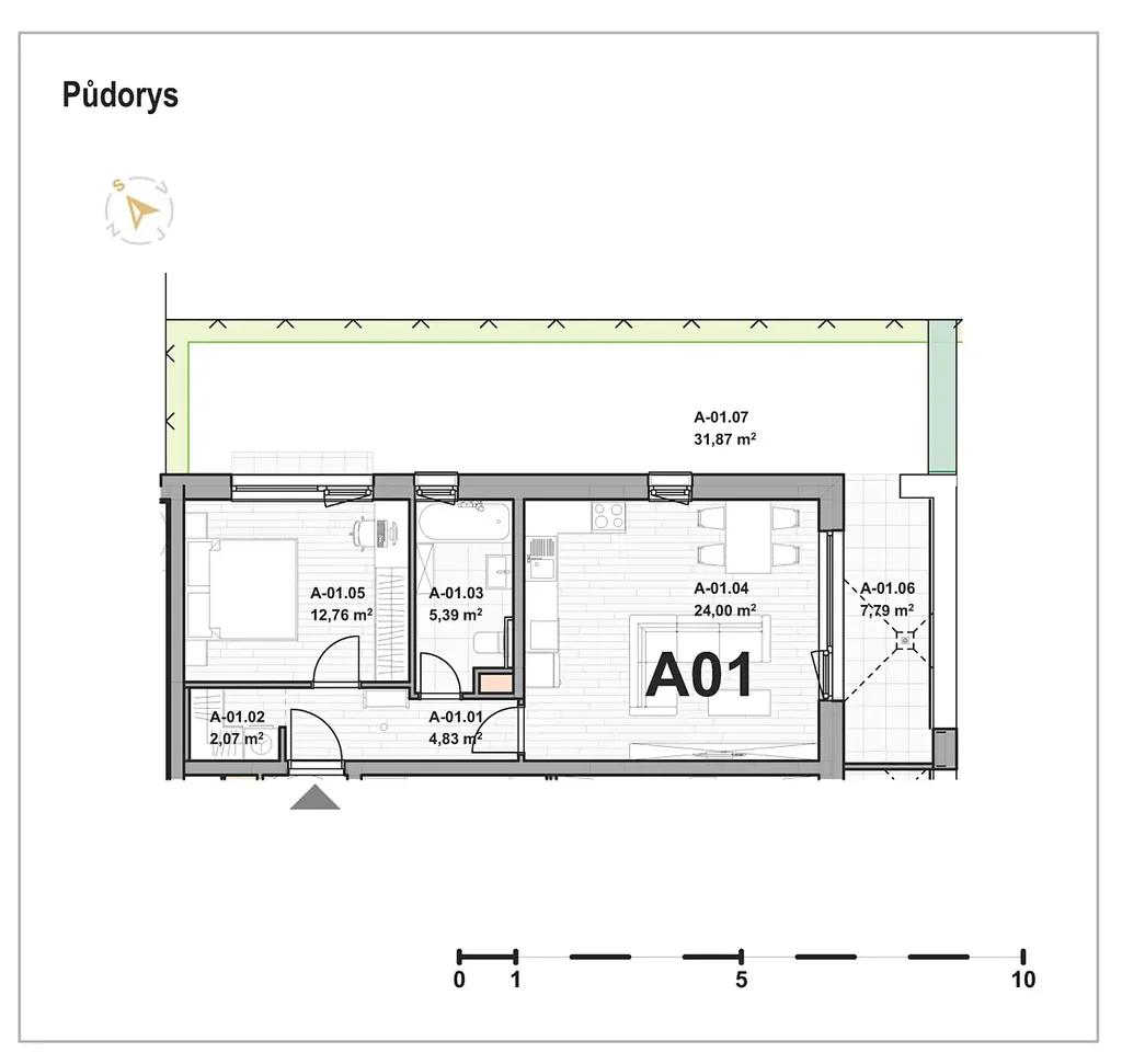 Do této kategorie patří i prezentovaný byt s označením BD4_A01 o dispozici 2+kk s celkovou plochou 93,34 m² (byt 49 m², terasa 7,79 m², zahrada 31,87 m² a sklep 4,64 m²).
