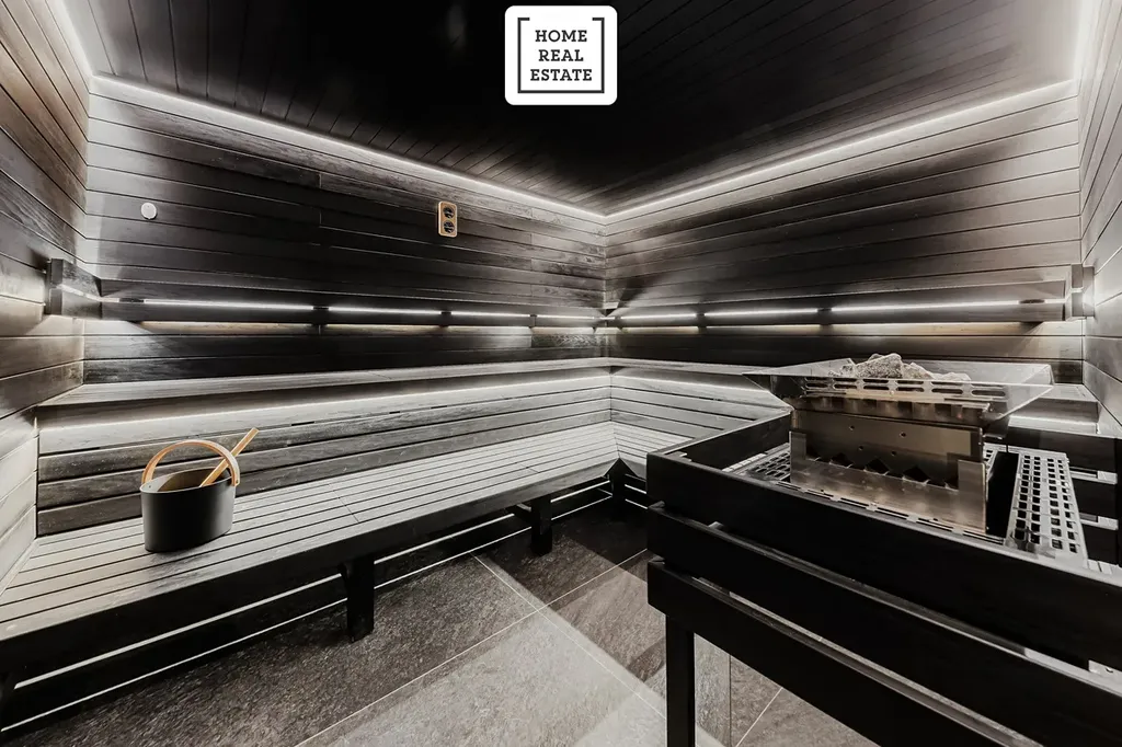 - Sdílené střešní terasy s výhledy na Prahu, venkovní saunou a grilovací zónou.
