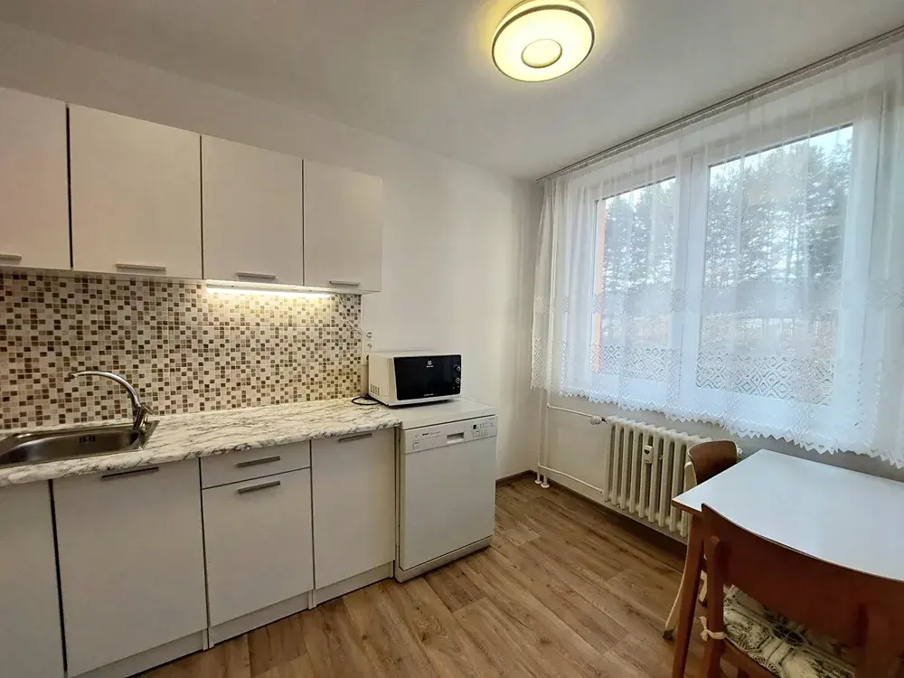 Nabízí se částečně zařízený, je zde pouze zánovní kuchyňská linka s kombinovaným sporákem, digestoř, lednice, myčka nádobí, mikrovlnná trouba, jídelní stůl a židle, v pokoji 2 komody, pračka, šatní skříň a věšáková stěna v předsíni.