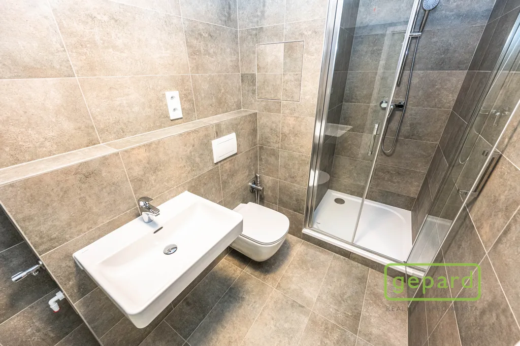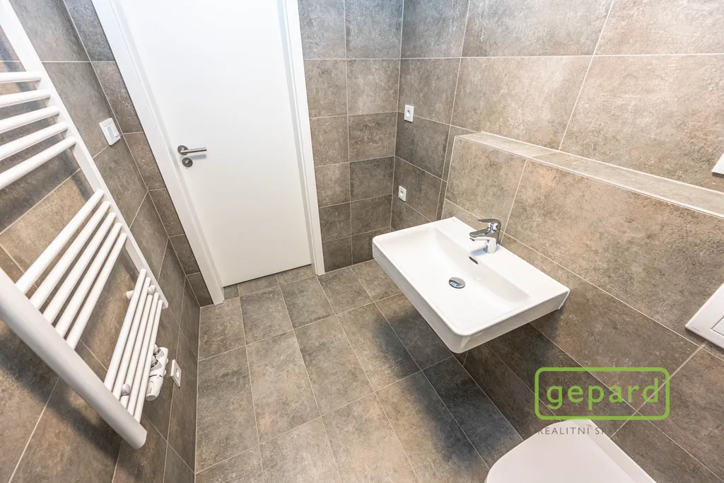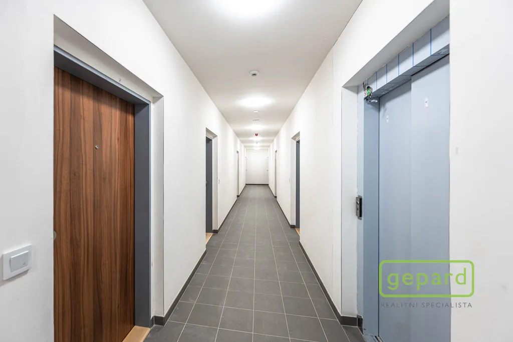 Bytová jednotka je vybavena laminátovou plovoucí podlahou v obytné části a keramickou dlažbou v předsíni a koupelně. V koupelně je sprchový kout, umyvadlo, WC s bidetovou sprchou a přípojka na pračku. Součástí bytu je příprava na kuchyňskou linku, exteriérové žaluzie, plastová okna s izolačním trojsklem a optický kabel pro TV a vysokorychlostní internet. Dům je nízkoenergetický, má dva výtahy a odpovídá vysokým standardům moderního bydlení. V domě je k dispozici společná kočárkárna/kolárna.