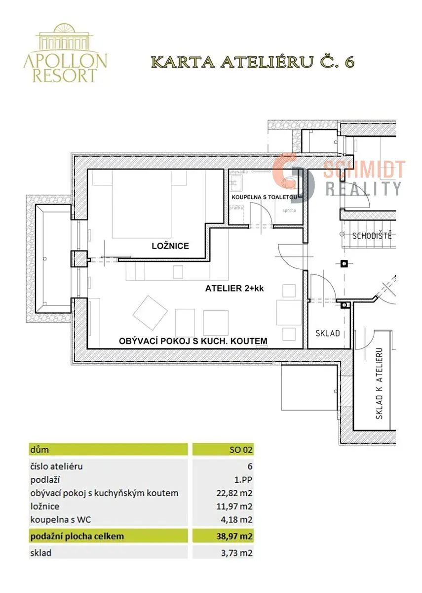 K jednotce náleží uzamykatelná skladová kóje o výměře 3,7m2 k uložení kol v suterénu.