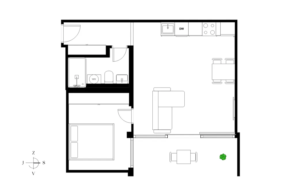 Dispozice bytu nabízí prostorný obývací pokoj s kuchyňským koutem a s přístupem na terasu o velikosti 7 m², která poskytuje příjemný prostor pro posezení s výhledem do klidného vnitrobloku a samostatnou ložnici s výhledem ven na terasu, koupelnu se sprchovým koutem a toaletou. Vstupní chodba poskytuje dostatek místa pro úložné řešení. K bytu náleží také prostorná sklepní kóje o velikosti 4 m².
