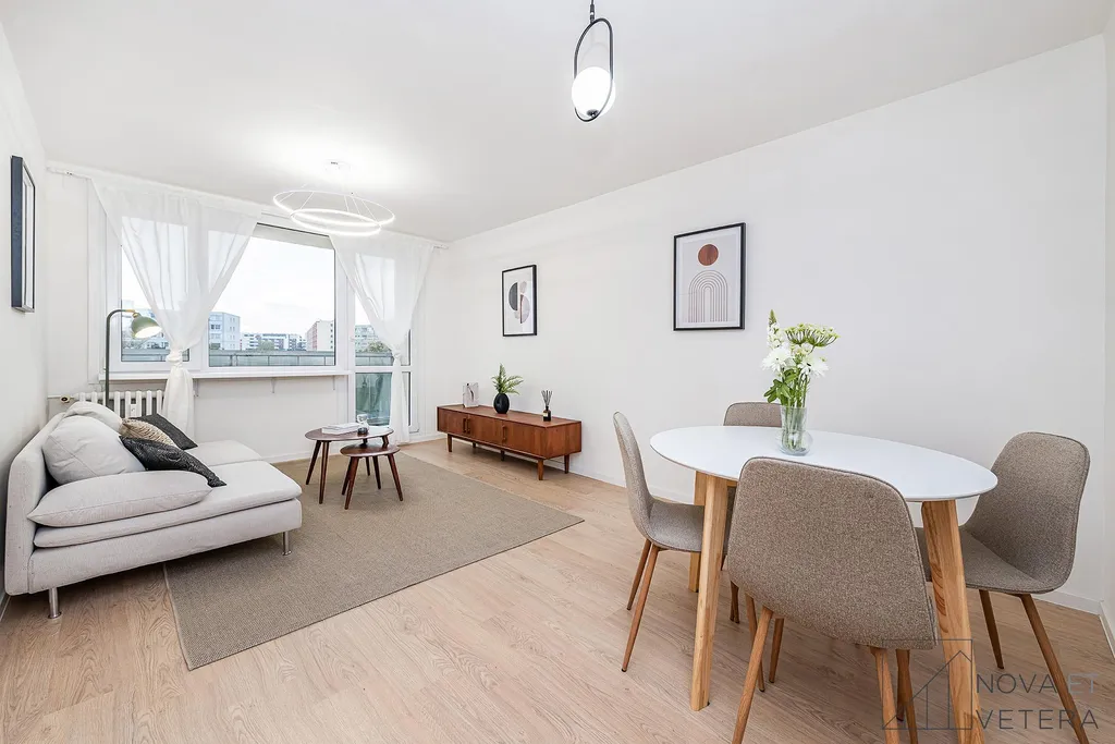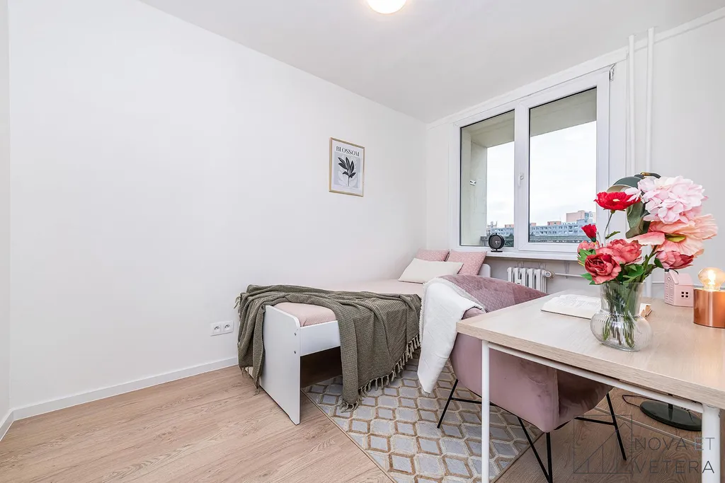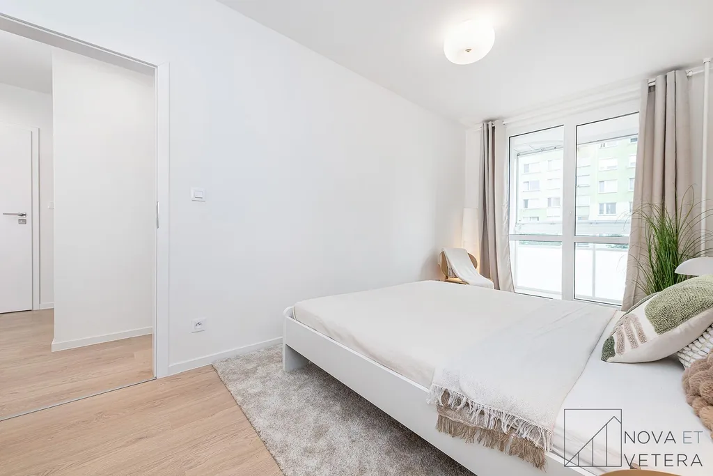 Jednotka je orientována na dvě světové strany - západ a sever. Světlý obývací pokoj disponuje vstupem na lodžii o velikosti 6 m² a s odděleným kuchyňským koutem. K dispozici jsou tři samostatné pokoje, které mohou sloužit jako ložnice, dětský pokoj, pracovna nebo pokoj pro hosty. Dva z pokojů mají vlastní vstup na lodžii, jedna o velikosti 3 m² a druhá 4,5 m². Moderní koupelna je vybavena sprchovým koutem a toaletou, druhá toaleta je samostatná. Vstupní chodba a samostatná místnost, která může sloužit jako komora nebo šatna nabízí dostatek úložného prostoru.
