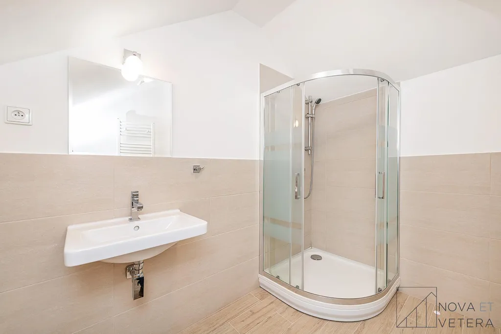 Samotná jednotka prošla před pěti lety kompletní rekonstrukcí a nabízí prakticky řešený dvoupodlažní prostor. Ve spodní úrovni se nachází prostorný obývací pokoj s kuchyňským koutem, dva neprůchozí pokoje, koupelna s vanou, samostatná toaleta a vstupní chodba s úložným prostorem. V podkroví je otevřený prostor ideální jako pracovna či ateliér a druhá koupelna se sprchovým koutem a toaletou.