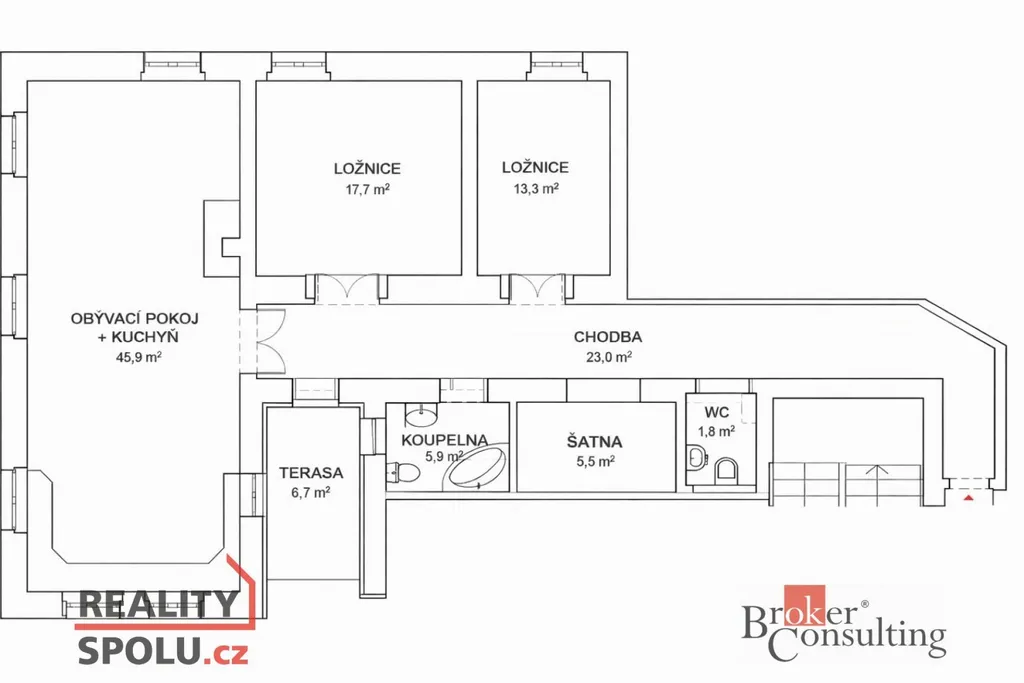 Velmi praktickým prvkem je prostorná chodba o výměře 23 m², kde je vyhrazeno samostatné místo pro šatnu o velikosti 5,5 m², což výrazně zvyšuje komfort a úložné možnosti bytu. K dispozici je koupelna se sprchovým koutem a toaletou o velikosti 6 m² a zároveň oddělené samostatné WC o ploše 2 m².