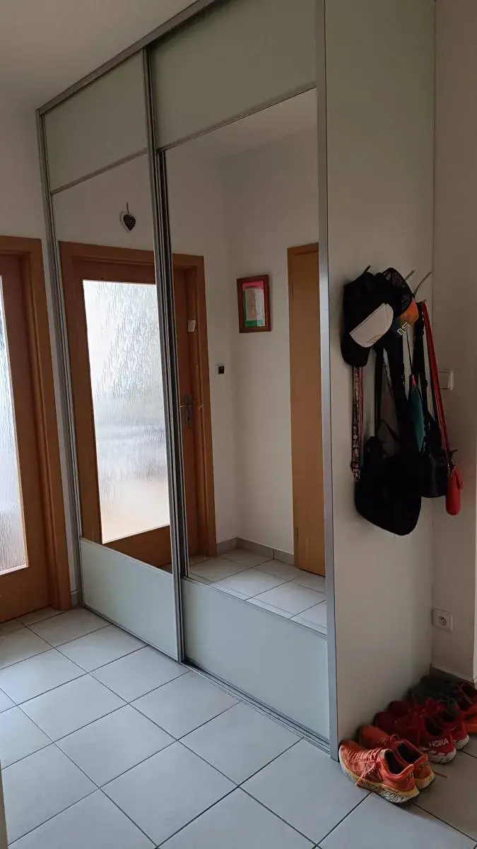 Dispozičně je byt řešen velmi prakticky. Obývací pokoj s kuchyňským koutem má plochu 20 m a je vybaven kuchyňskou linkou na míru se zabudovanými spotřebiči. Z obývací části je přímý vstup na balkon. Ložnice o velikosti 12 m nabízí dostatek prostoru i klidu. Předsíň o výměře 7,6 m je vybavena vestavěnými skříněmi a poskytuje velké množství úložného prostoru. Koupelna je se sprchovým koutem a elektrickým bojlerem, toaleta je samostatná. Součástí bytu je také menší šatna.